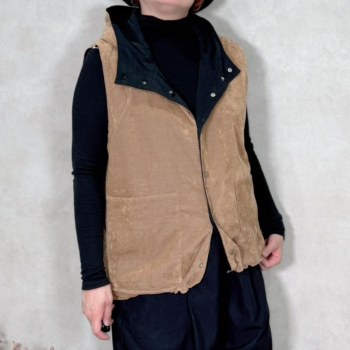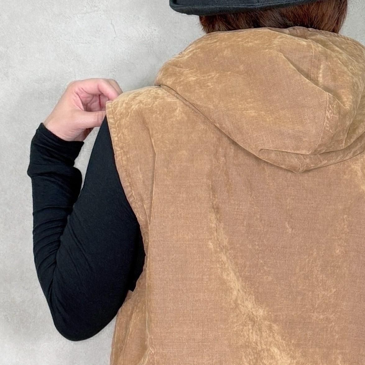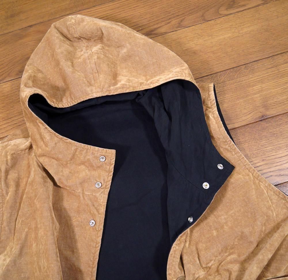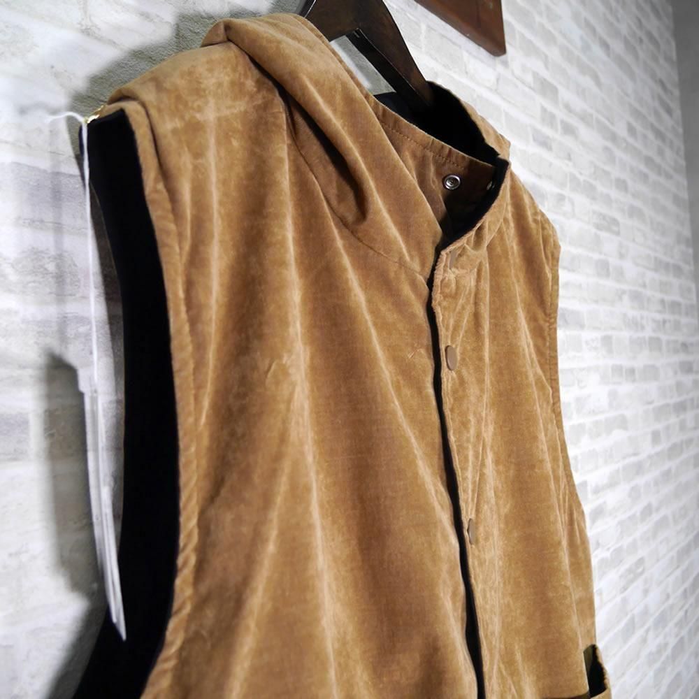 2つの素材で楽しめるリバーシブルのアノラックベストです。裾にはドローコードが付いているので、シルエットの変化も楽しんで頂けます。暖かみのある素材感(薄手のコーデュロイ)&さらっとした表情のシンプルな素材感。どちらも使いやすいお色目です。