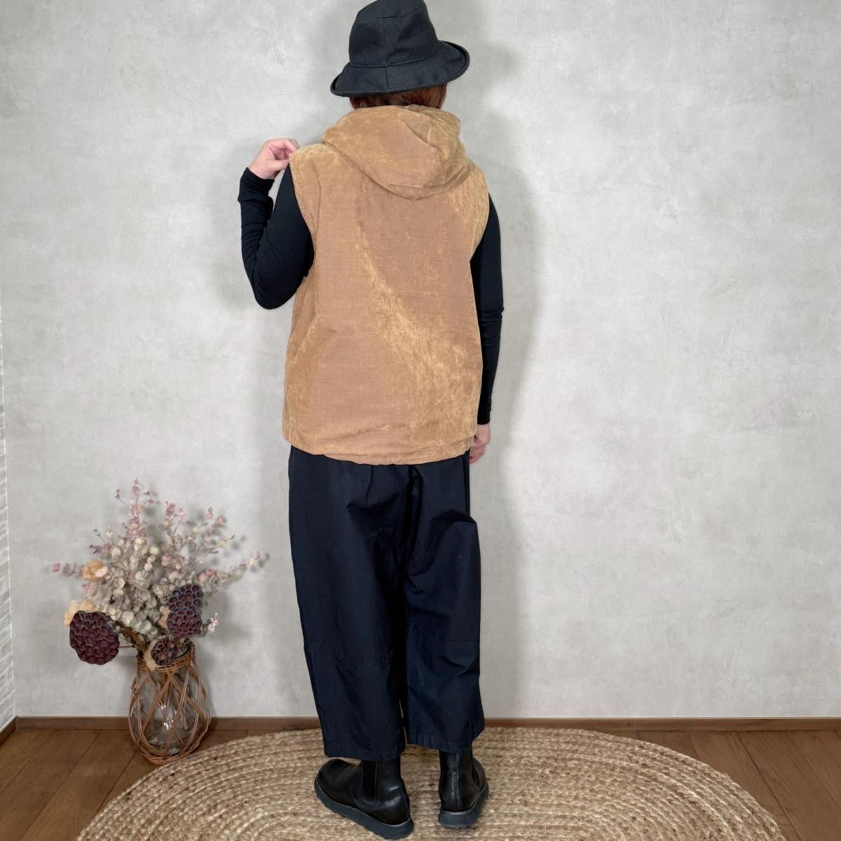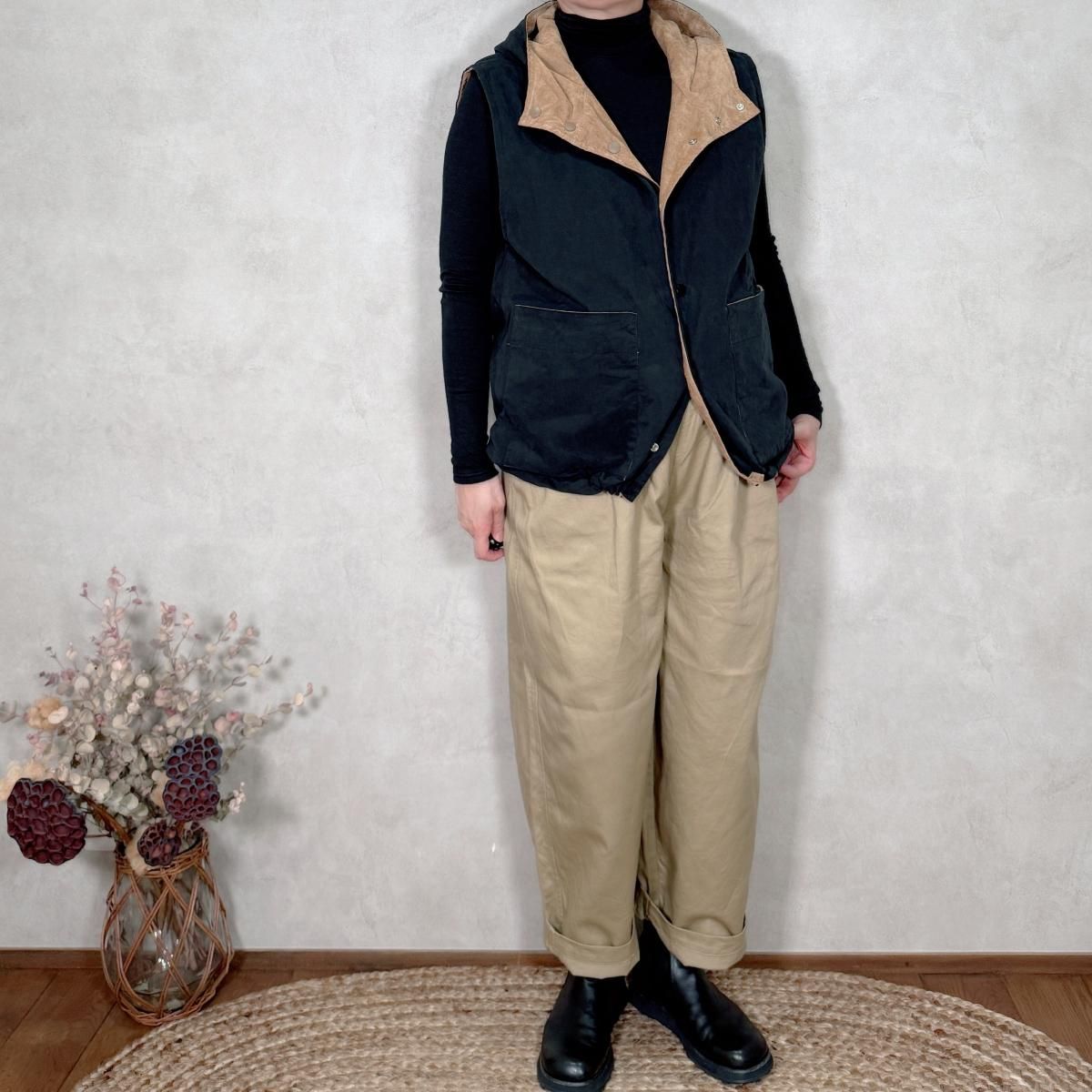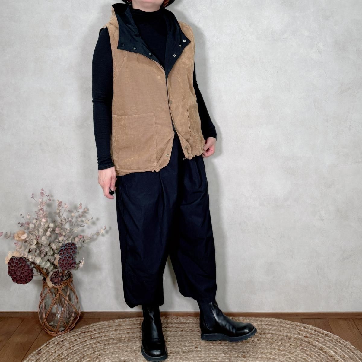 2つの素材で楽しめるリバーシブルのアノラックベストです。裾にはドローコードが付いているので、シルエットの変化も楽しんで頂けます。暖かみのある素材感(薄手のコーデュロイ)&さらっとした表情のシンプルな素材感。どちらも使いやすいお色目です。
