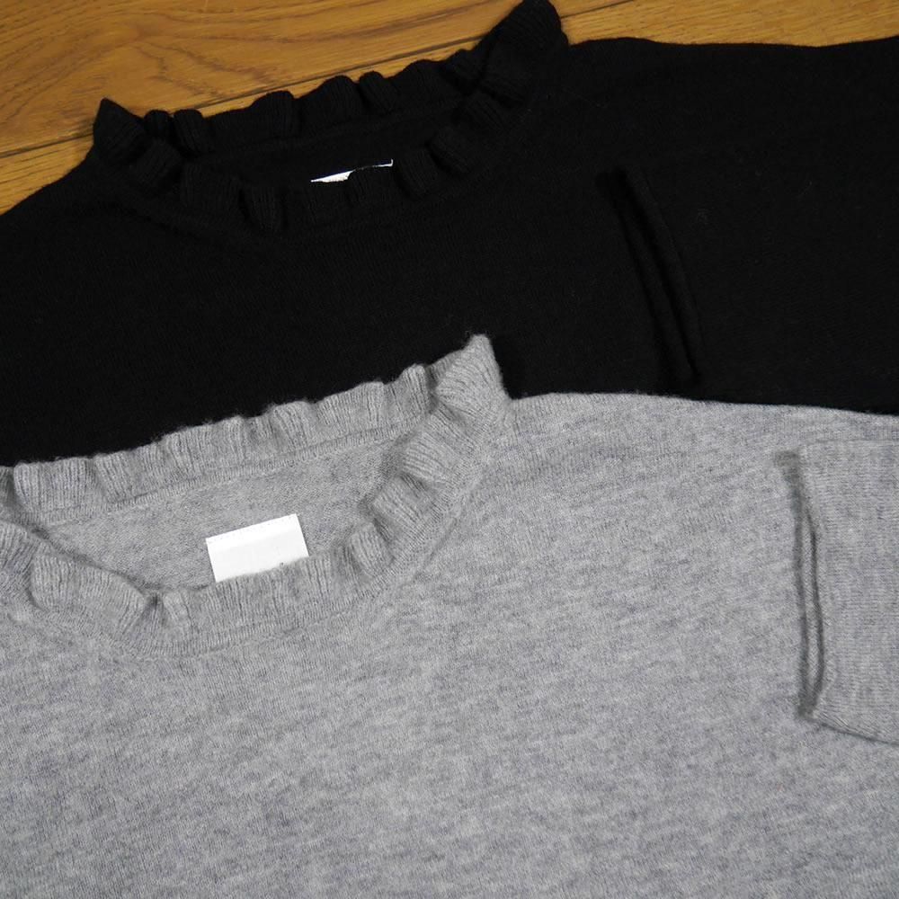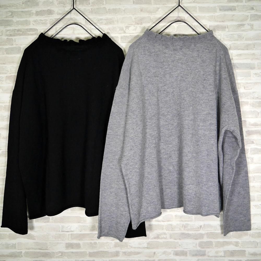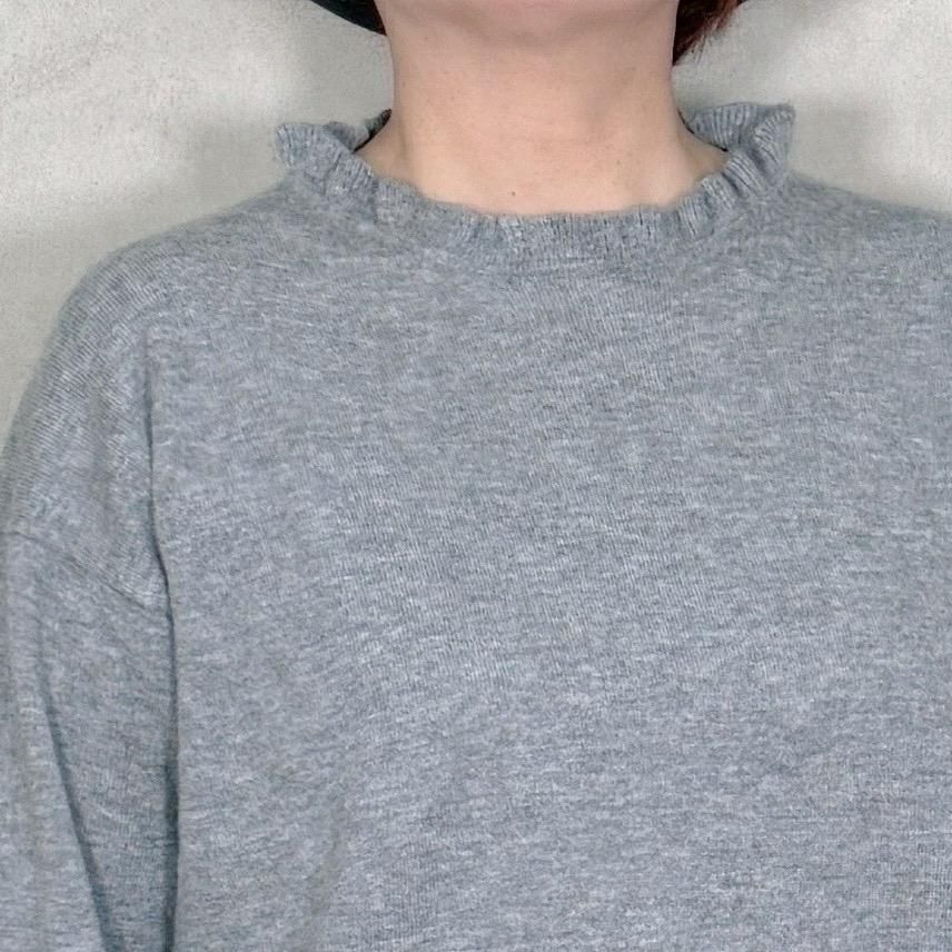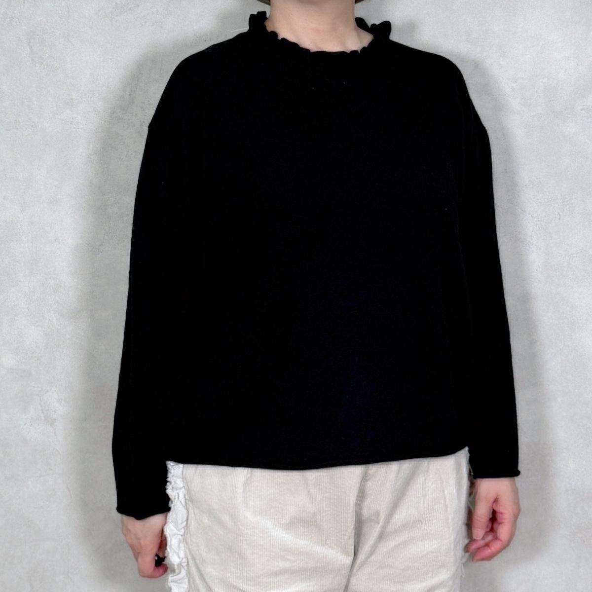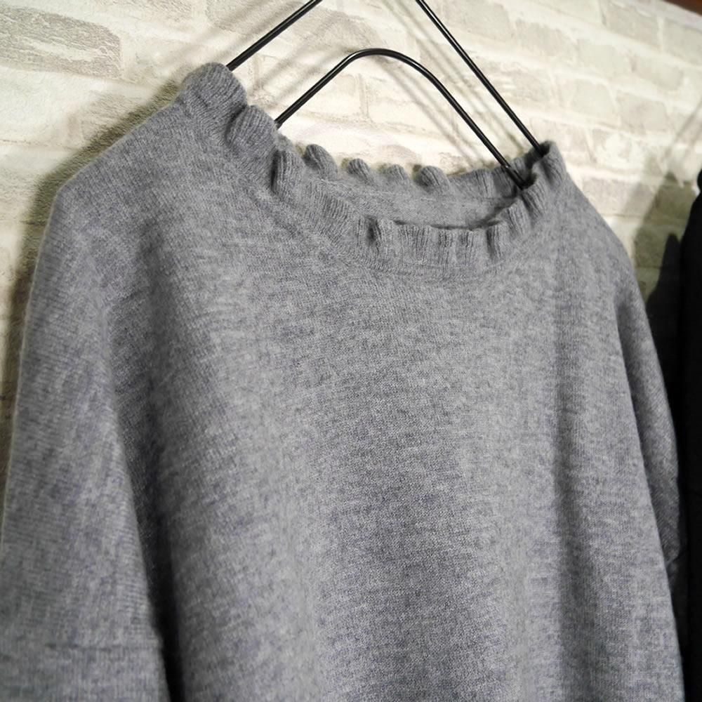 薄手で使いやすいWool 100%のニットプルオーバーです。首元のフリルがデザインのアクセントになっています。ふんわりと柔らかな優しい風合いのニットです。シンプルなので、あらゆるボトムスと合わせて頂きやすい1着です。