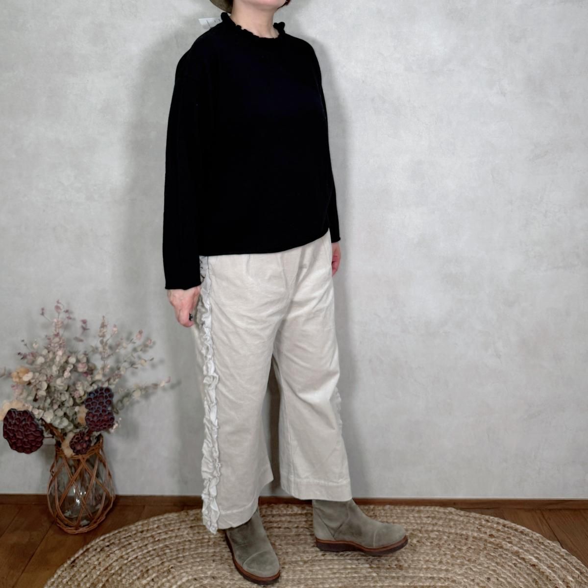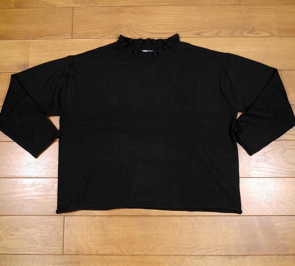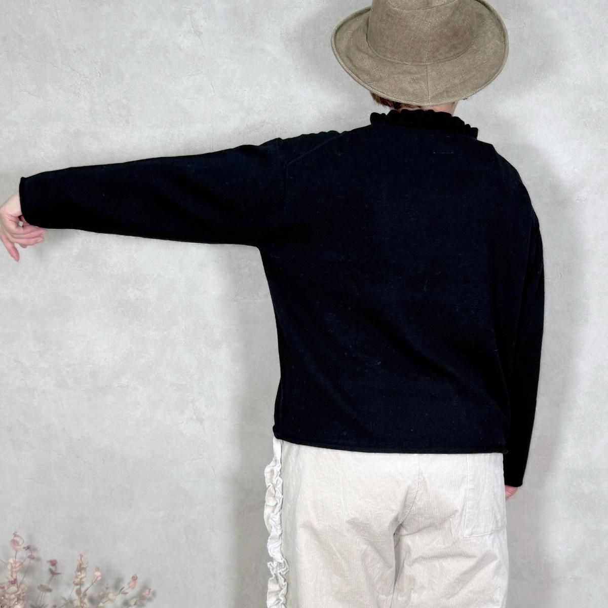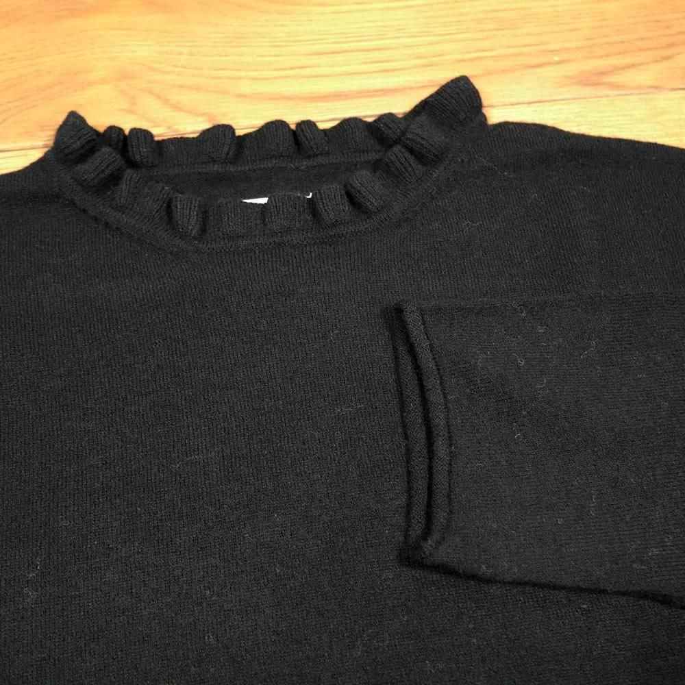 薄手で使いやすいWool 100%のニットプルオーバーです。首元のフリルがデザインのアクセントになっています。ふんわりと柔らかな優しい風合いのニットです。シンプルなので、あらゆるボトムスと合わせて頂きやすい1着です。