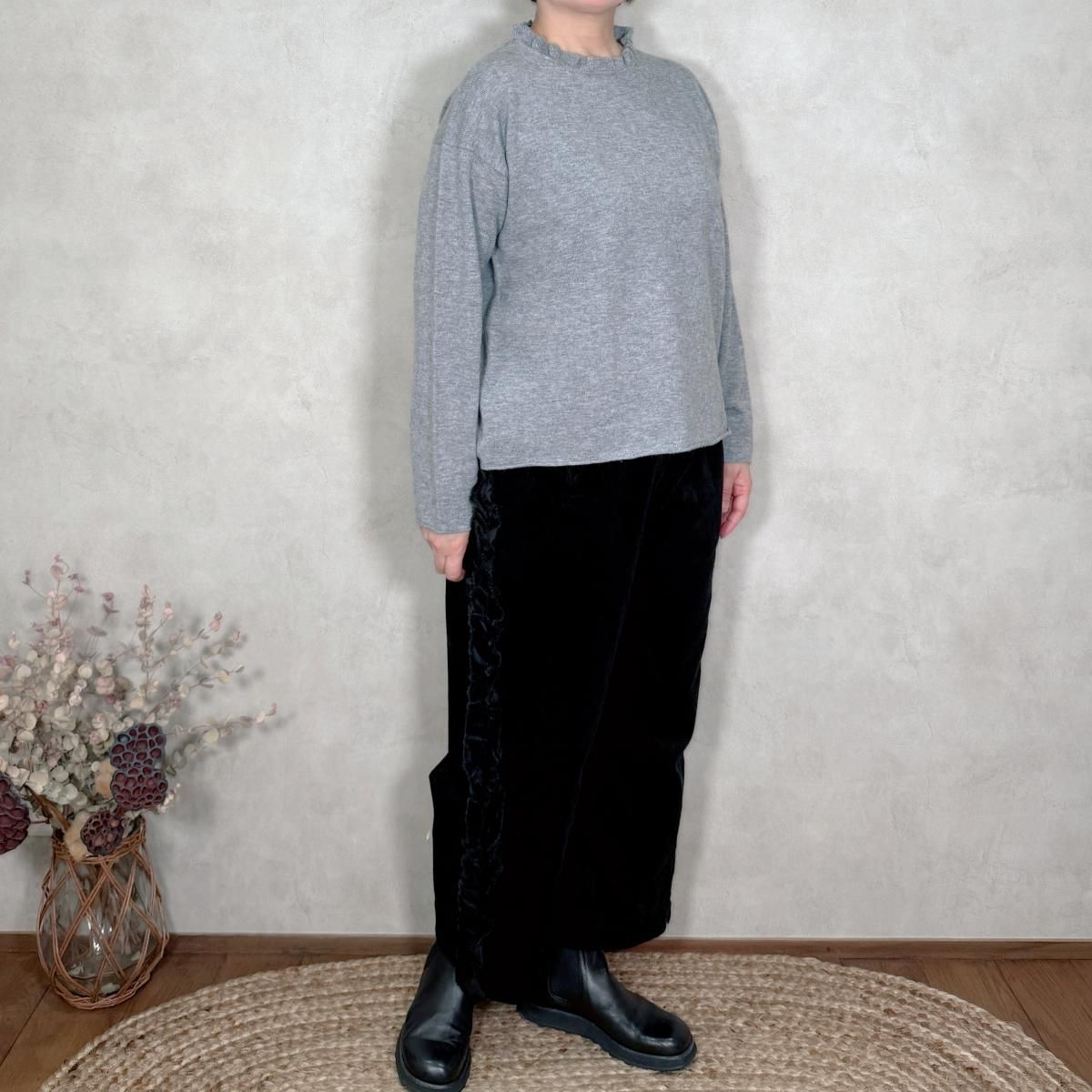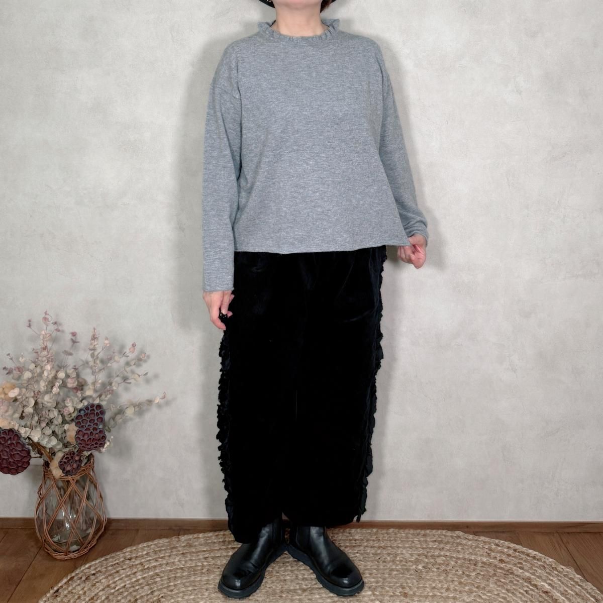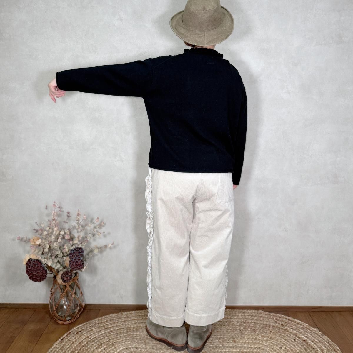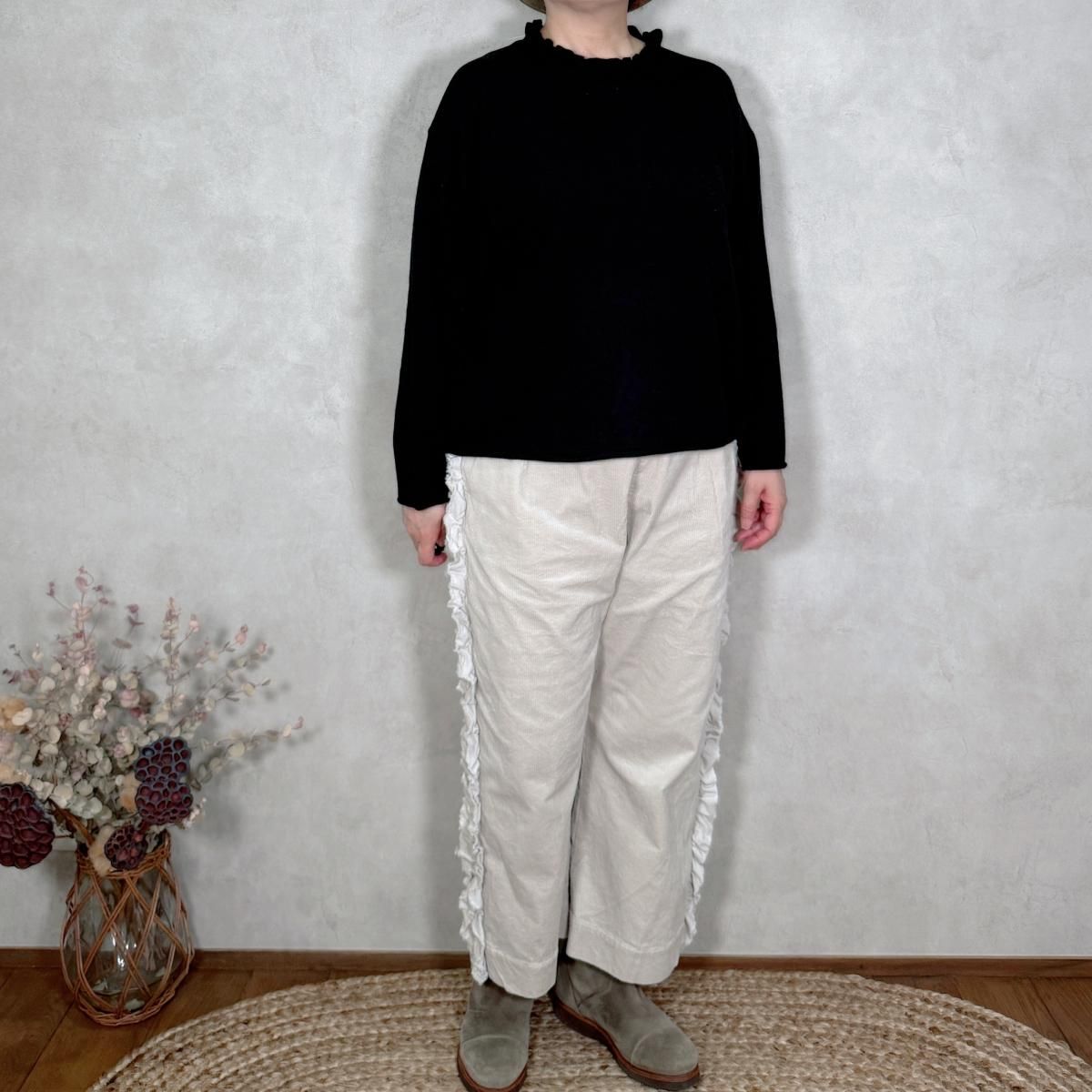 薄手で使いやすいWool 100%のニットプルオーバーです。首元のフリルがデザインのアクセントになっています。ふんわりと柔らかな優しい風合いのニットです。シンプルなので、あらゆるボトムスと合わせて頂きやすい1着です。
