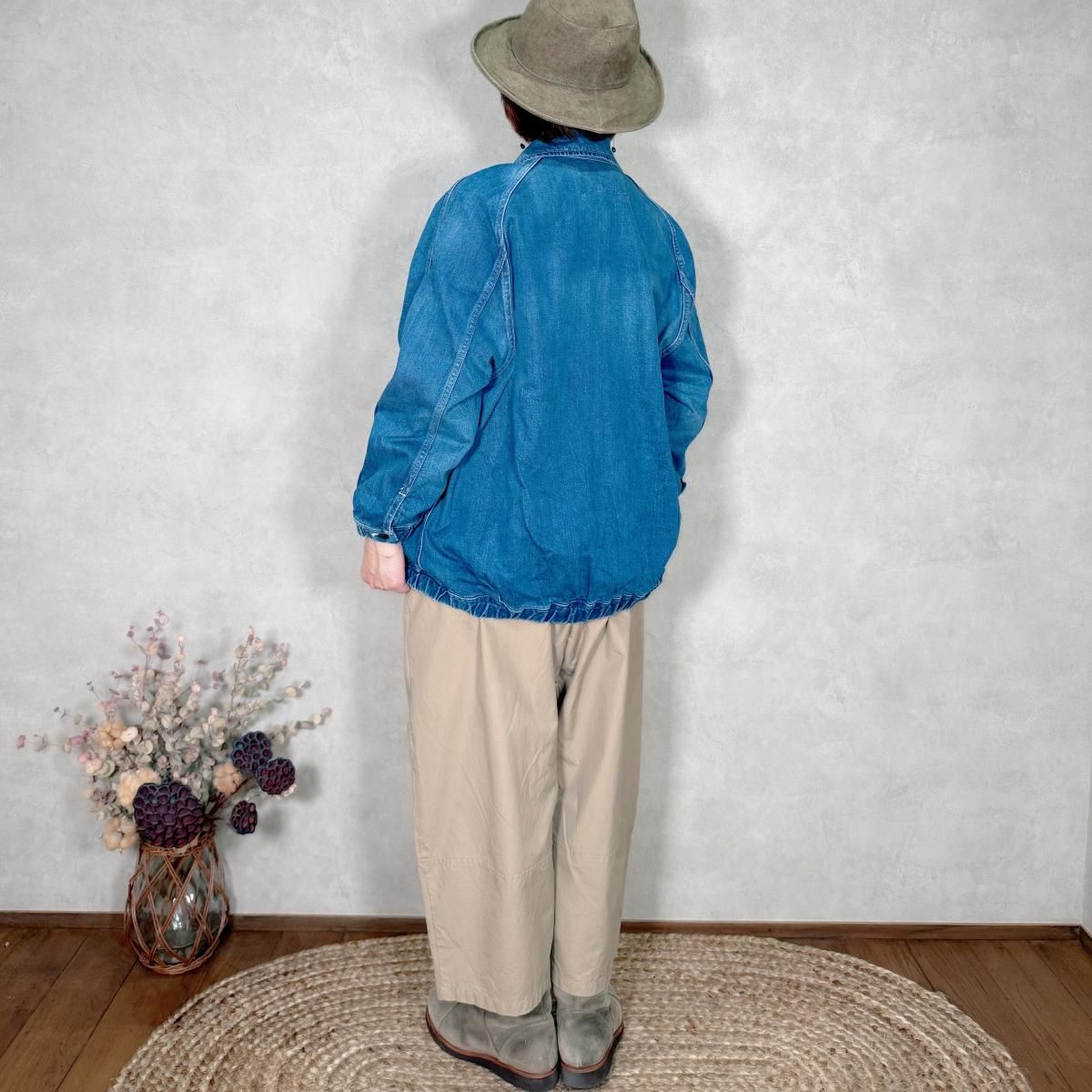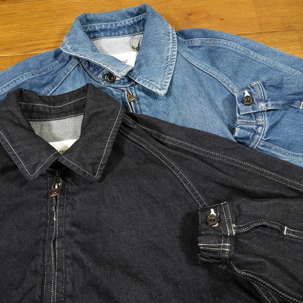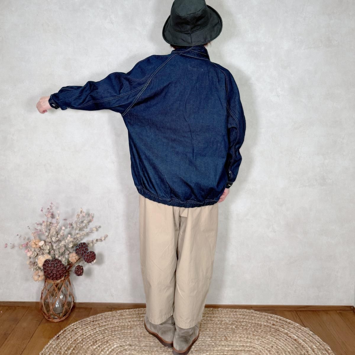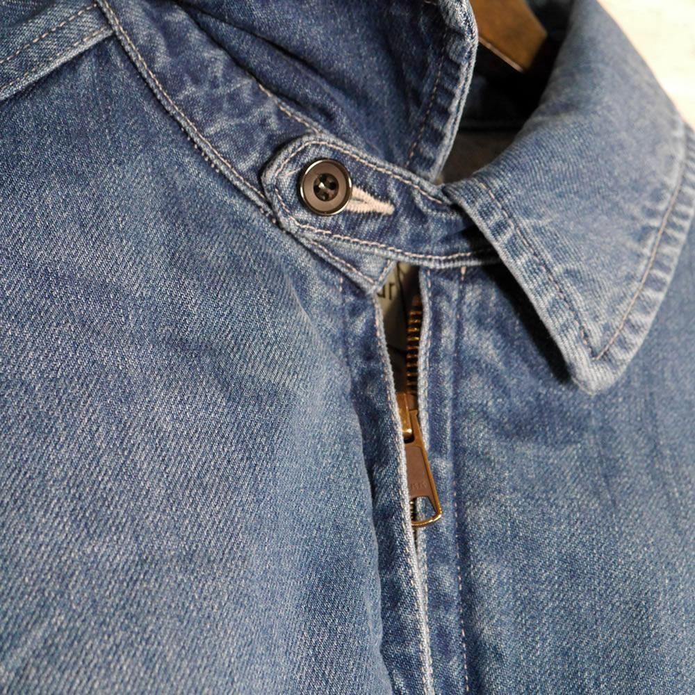 デニムの産地である岡山県の福山市で織られた 11.8 オンスのデニム素材使ったブルゾンです。たて糸には超長綿の一つであるスーピマコットンを混ぜた甘撚り糸を使用。ピュアインディゴを用い、糸の中心が白く残るロープ染色をしているためアタリが出て経年変化を味わうことができます。