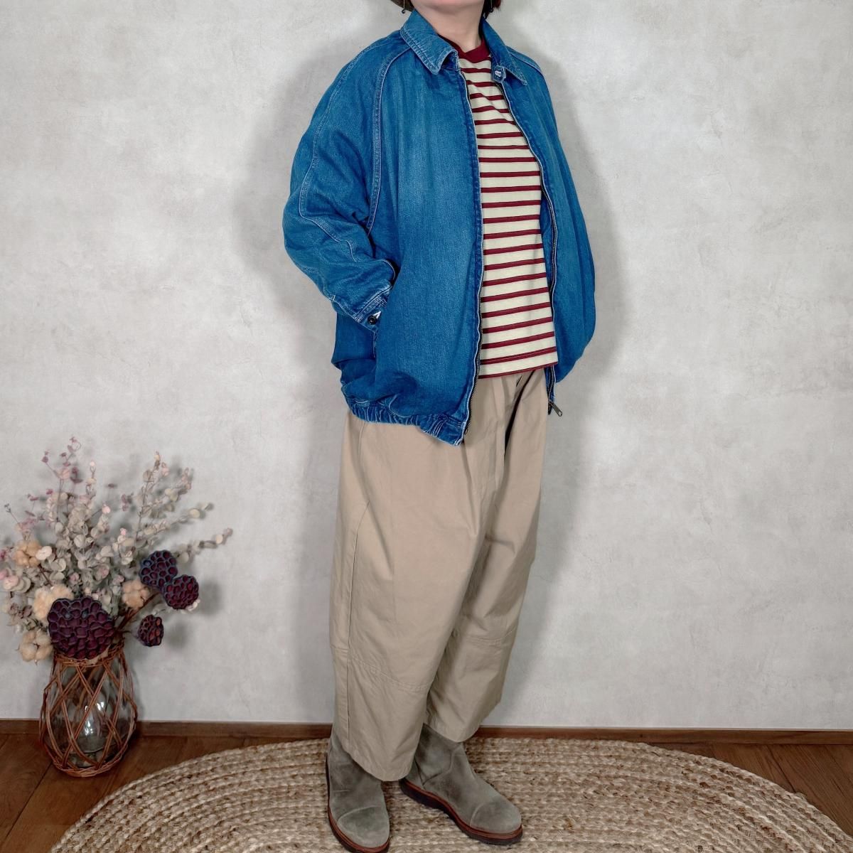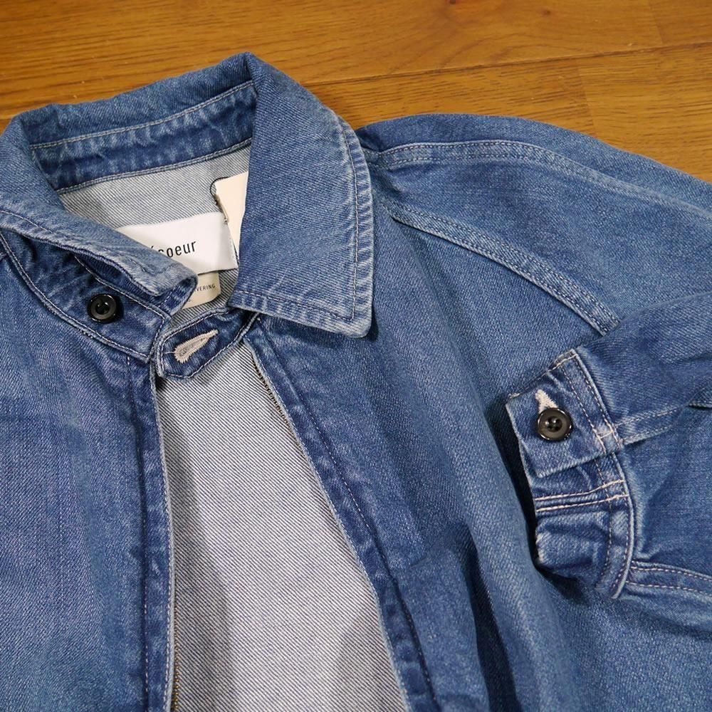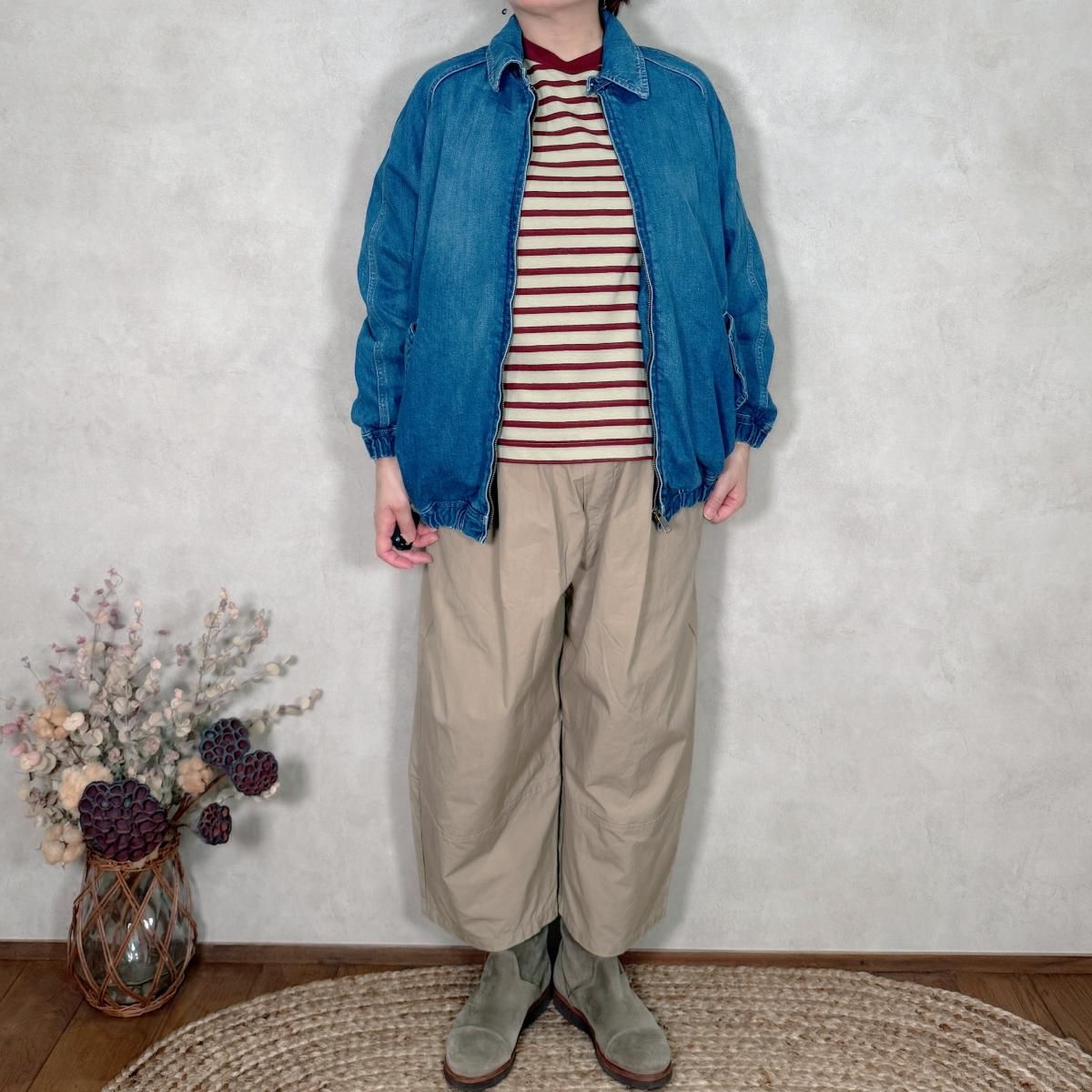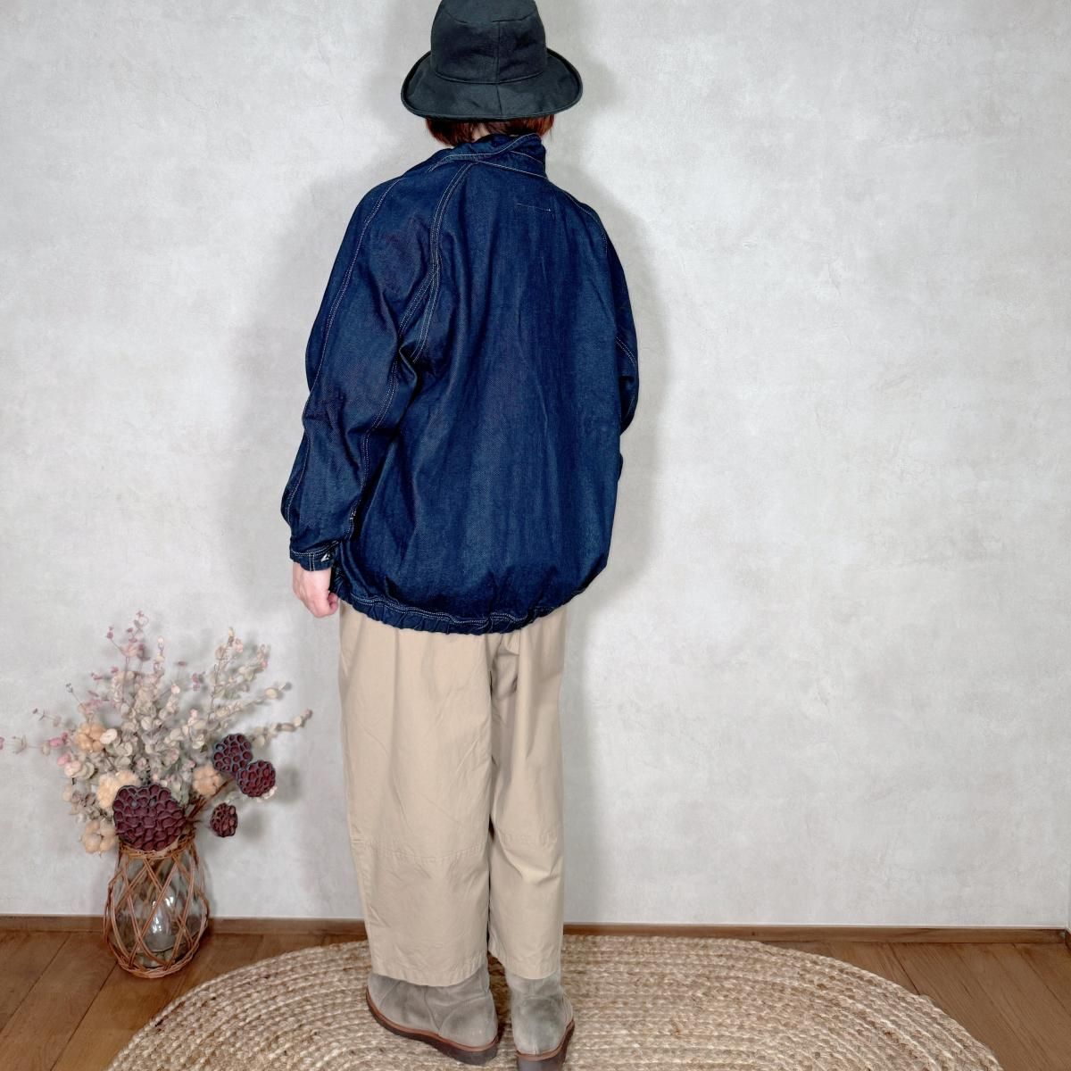 デニムの産地である岡山県の福山市で織られた 11.8 オンスのデニム素材使ったブルゾンです。たて糸には超長綿の一つであるスーピマコットンを混ぜた甘撚り糸を使用。ピュアインディゴを用い、糸の中心が白く残るロープ染色をしているためアタリが出て経年変化を味わうことができます。