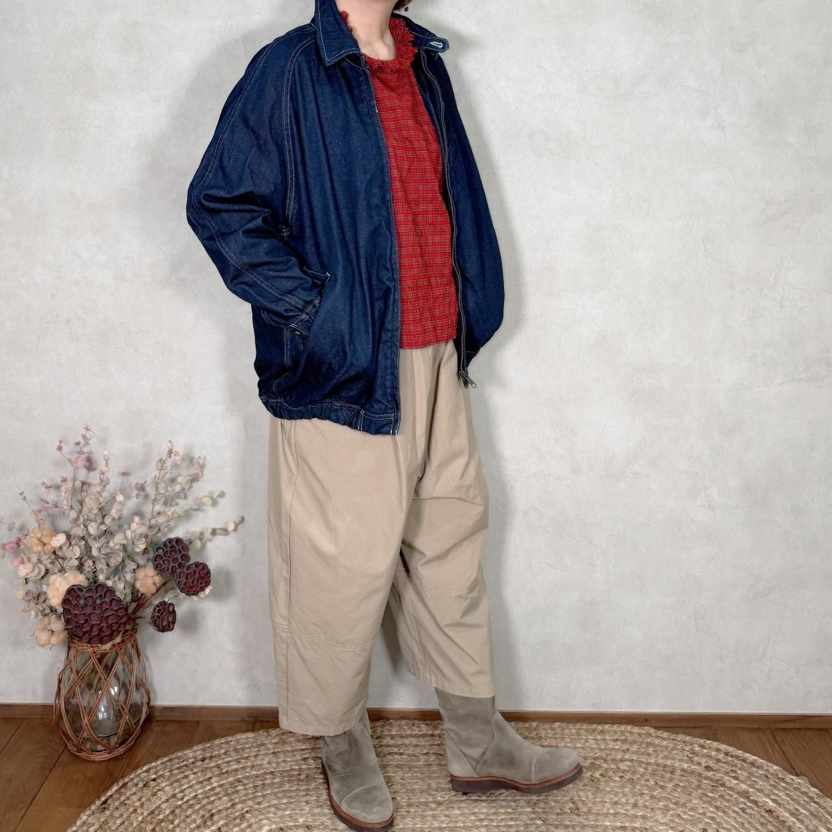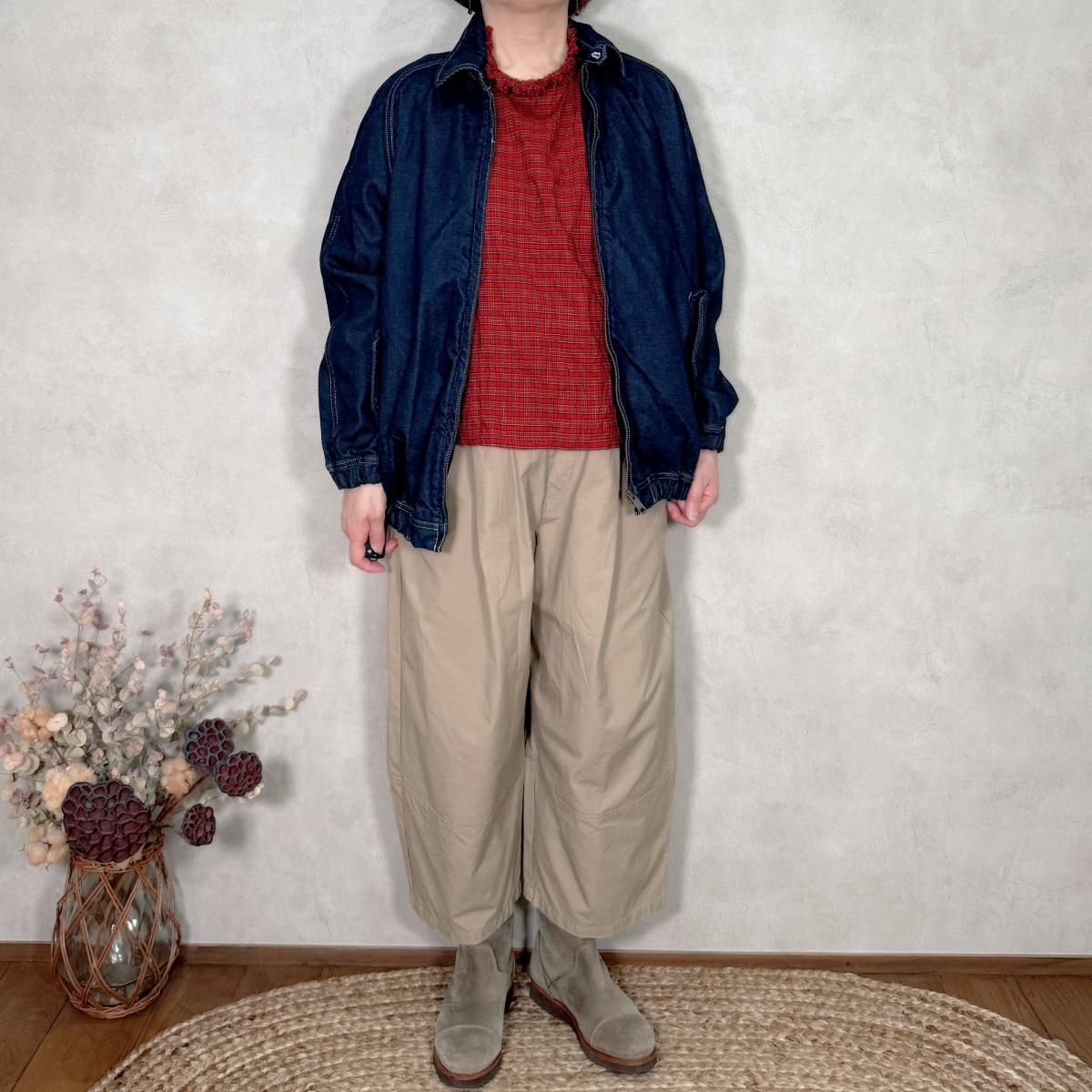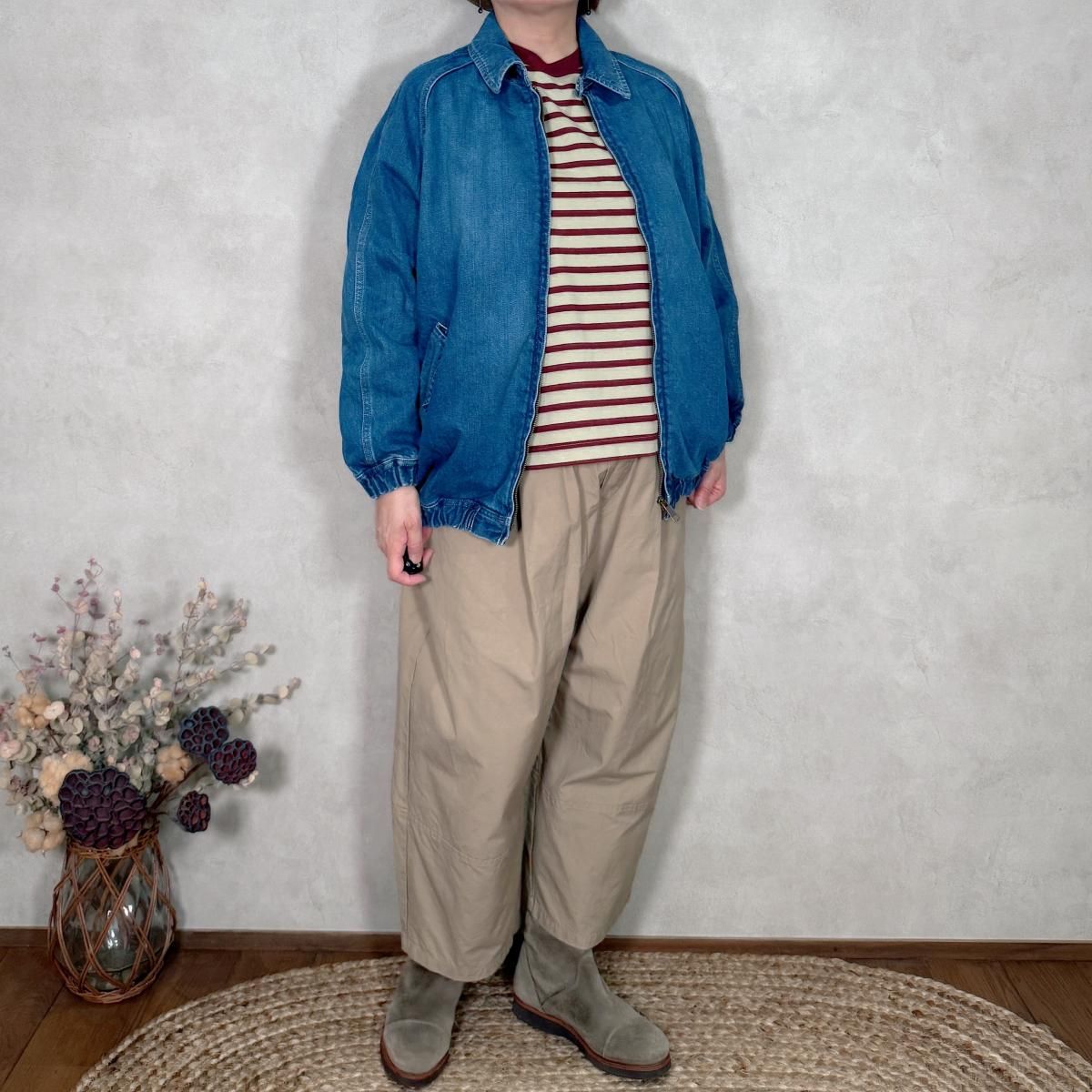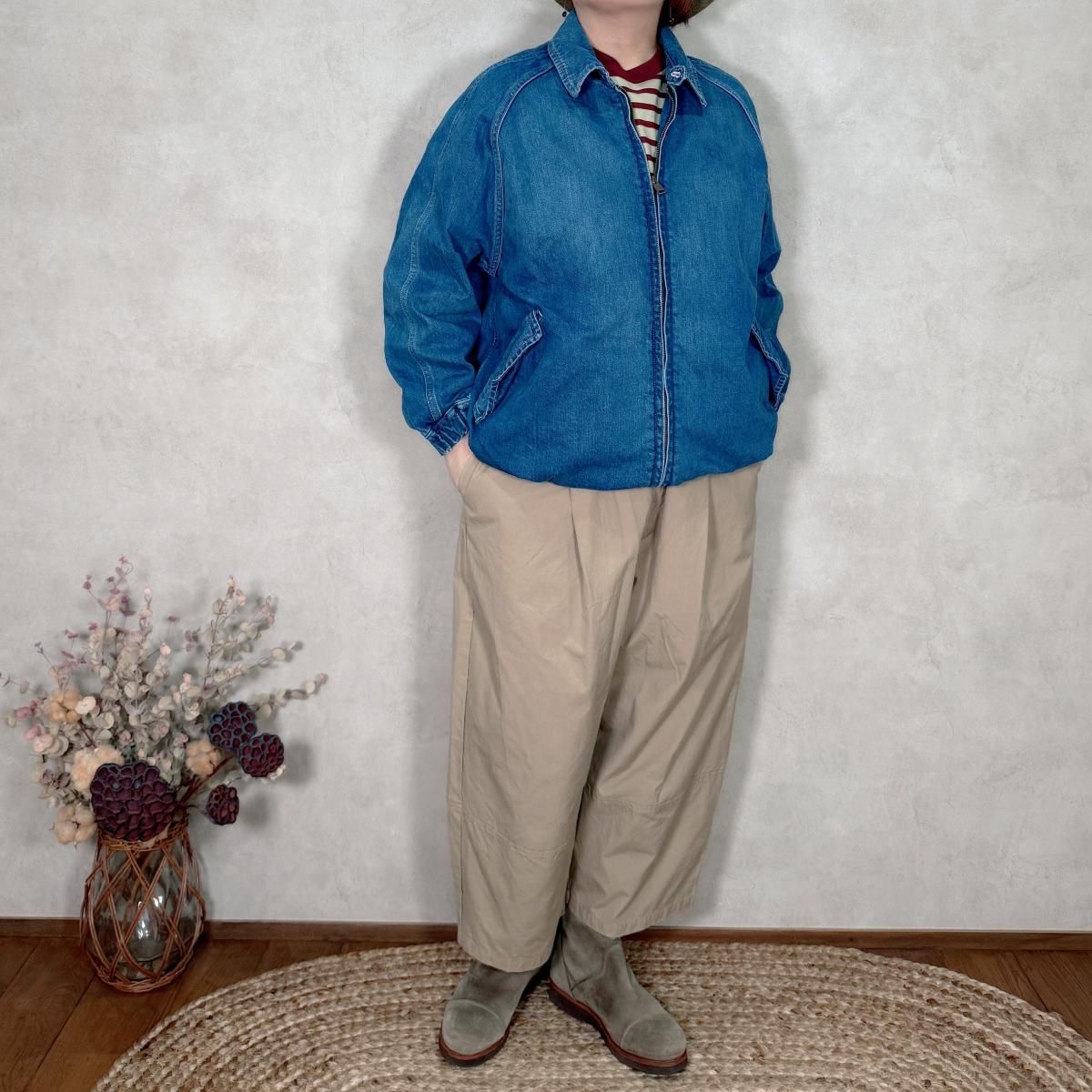 デニムの産地である岡山県の福山市で織られた 11.8 オンスのデニム素材使ったブルゾンです。たて糸には超長綿の一つであるスーピマコットンを混ぜた甘撚り糸を使用。ピュアインディゴを用い、糸の中心が白く残るロープ染色をしているためアタリが出て経年変化を味わうことができます。