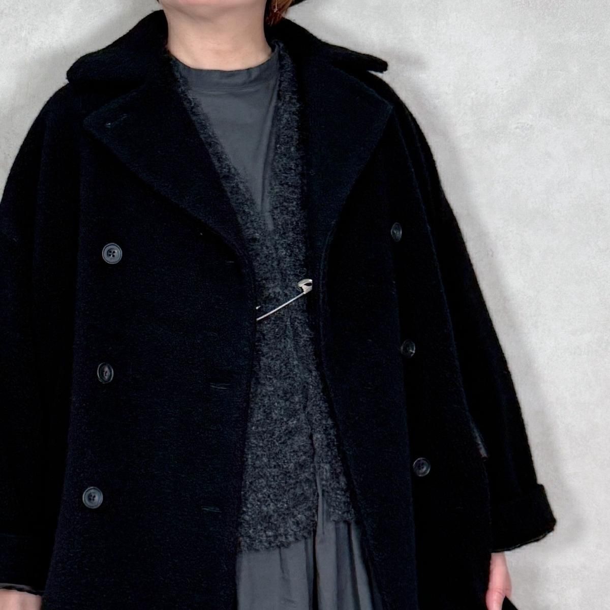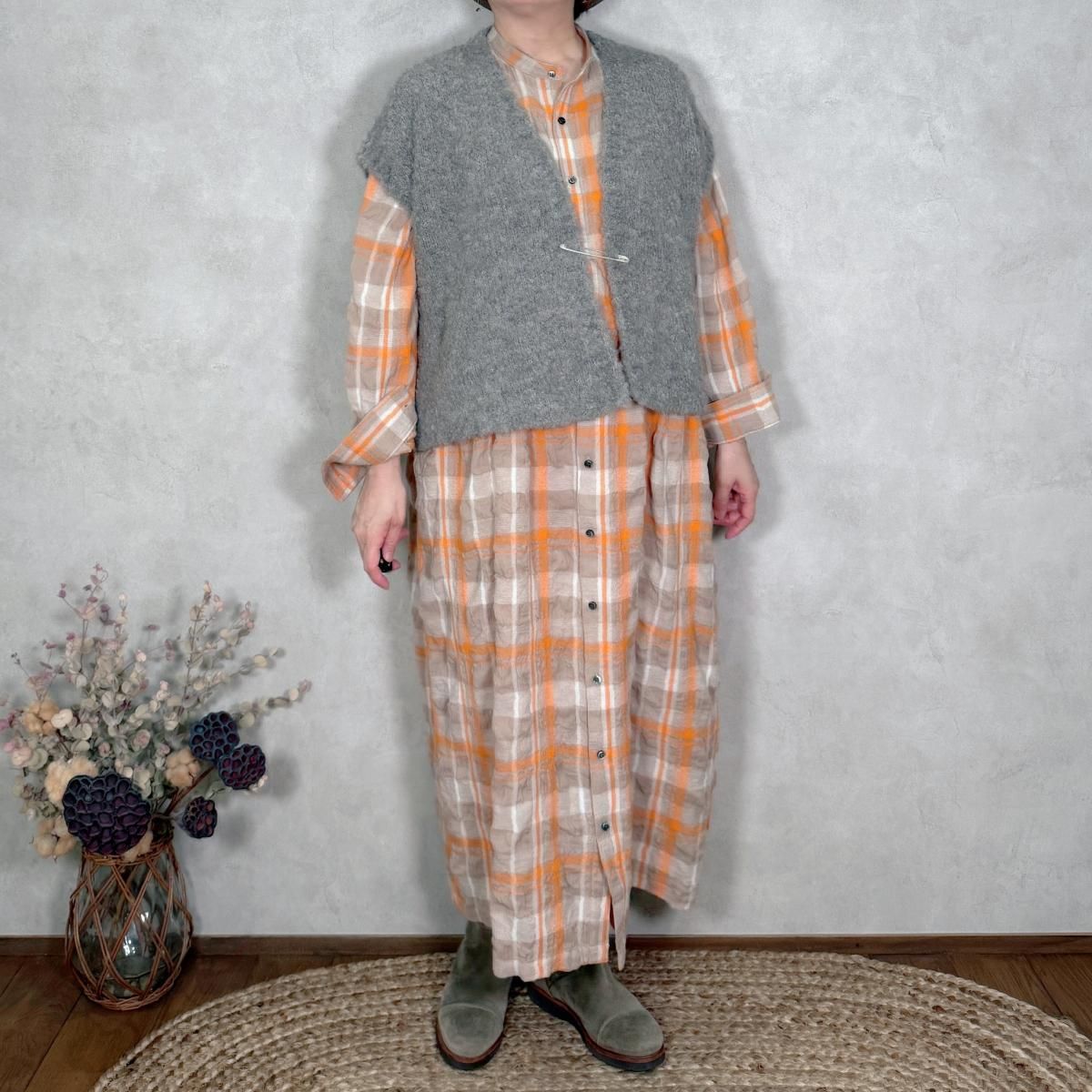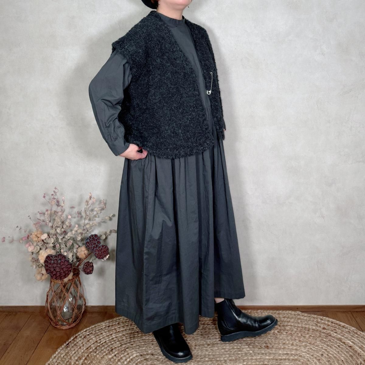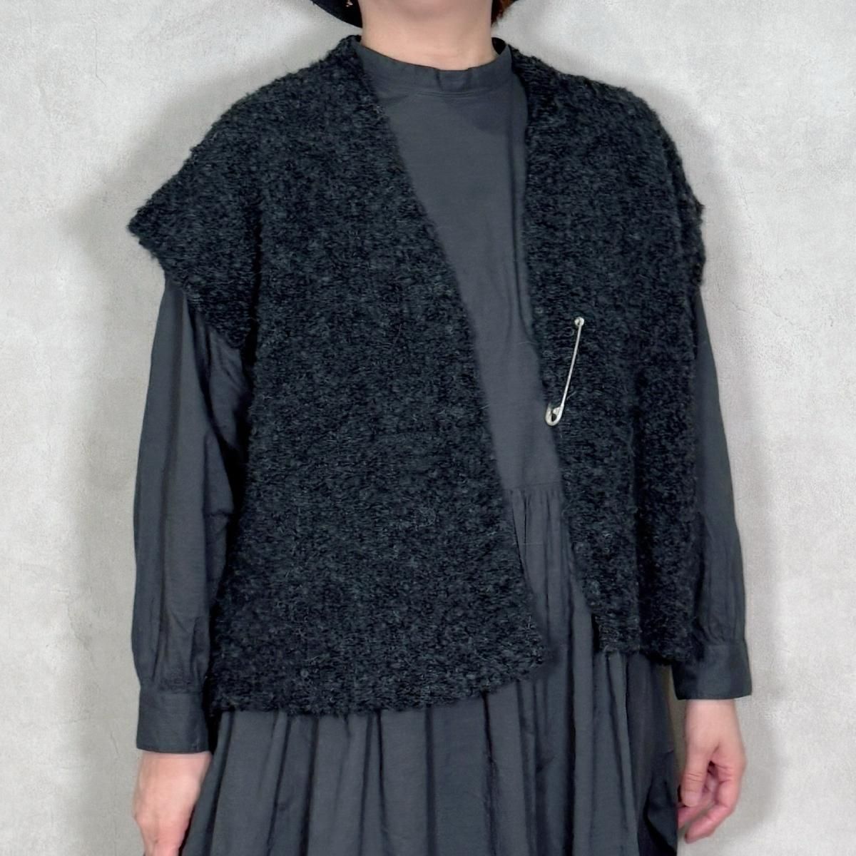 新型のショート丈Vネックベストです。付属のキルトピンで、前を留めて着用することも可能。冬場はコートの下に忍ばせて、レイヤードを楽しめる一枚です。ワンピースのみならず、パンツやスカートスタイルにも合わせ易い1着。
