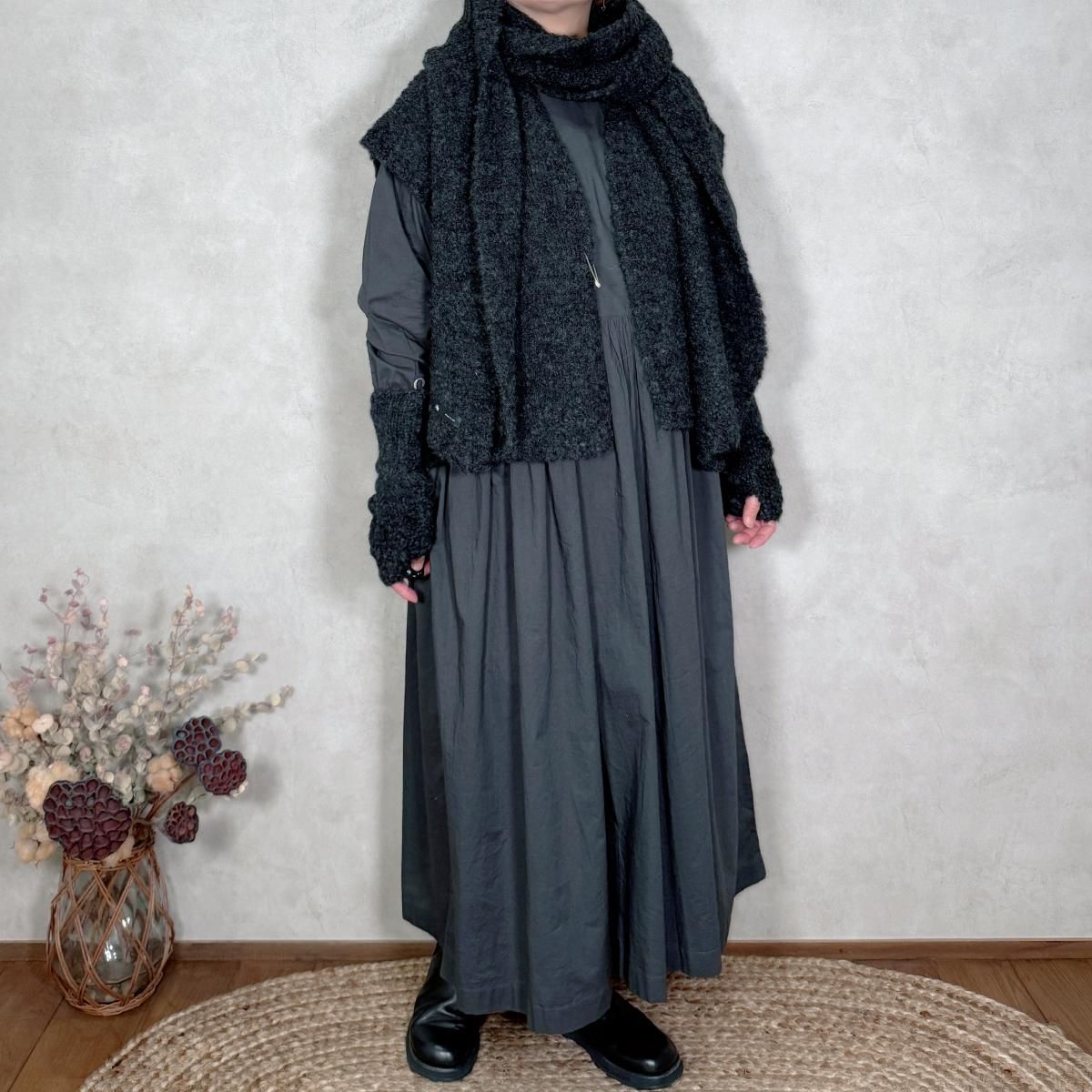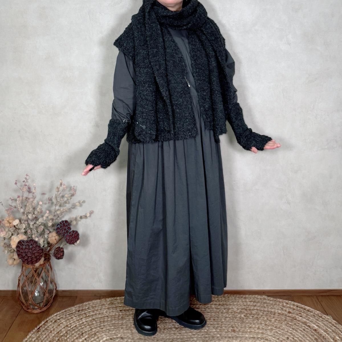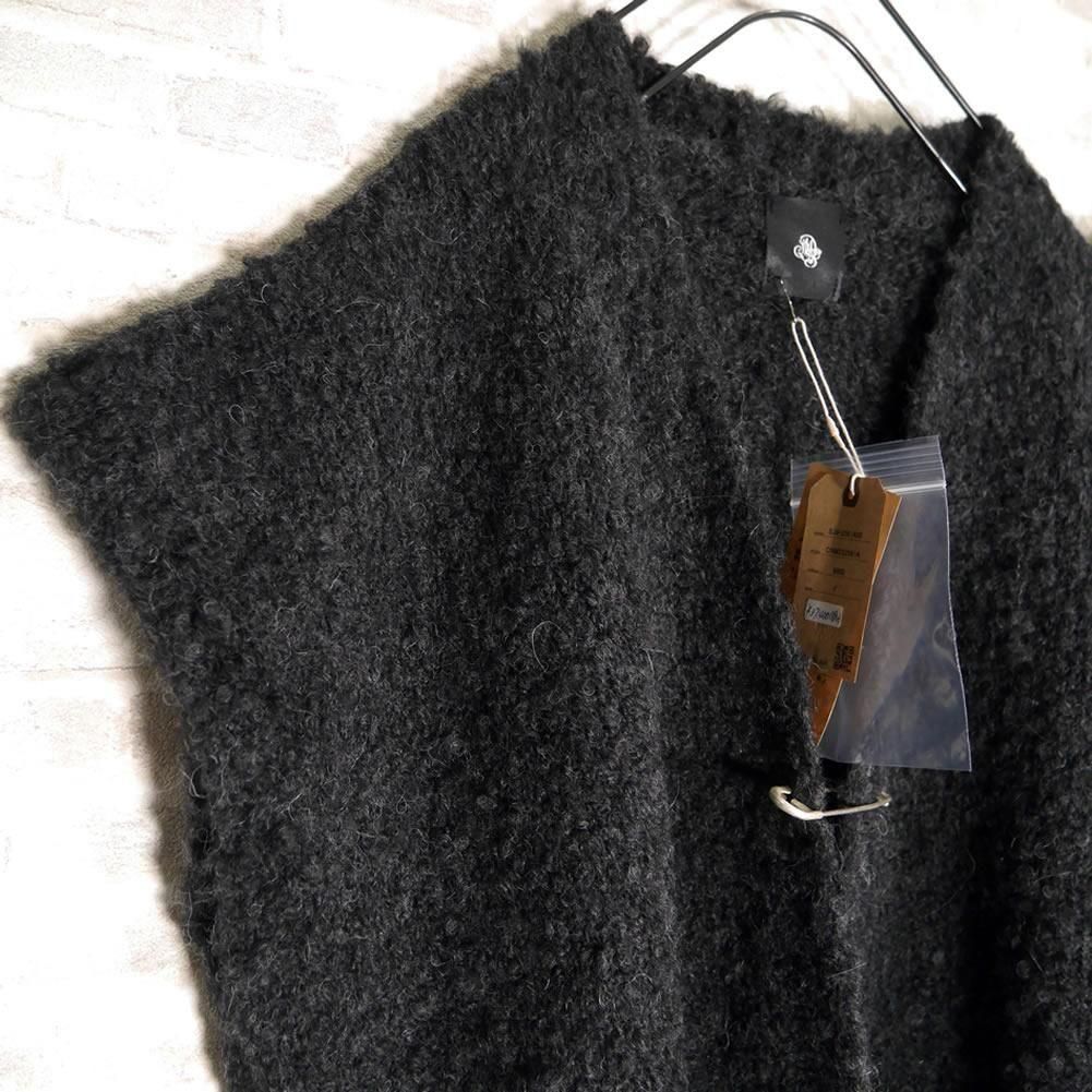 表面にループ状の糸が出るように加工されたブークレ糸で編み立てられ、もこもことした素材感が見た目にも暖かなニットベストです。素材はアルパカをメインに、ウールとナイロンを混紡した糸を使用し、ふわふわと軽く、重さを感じにくいので、着心地の良さも抜群。