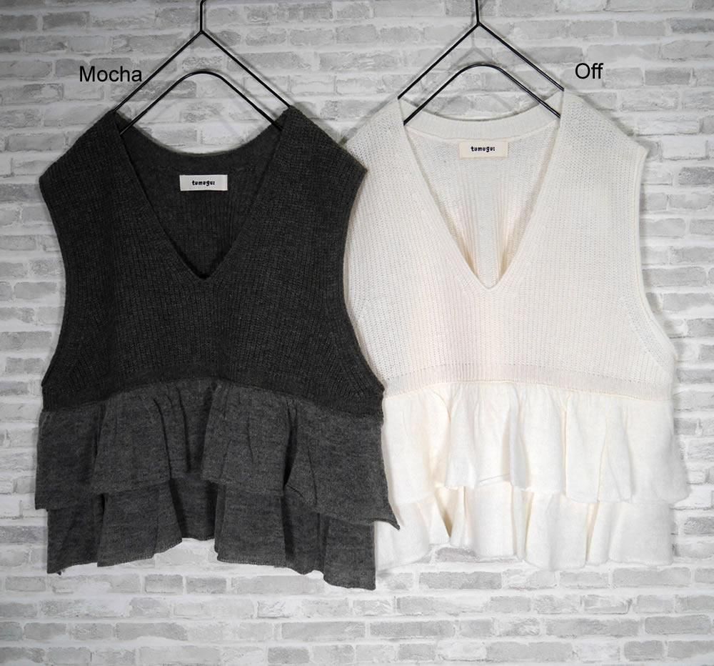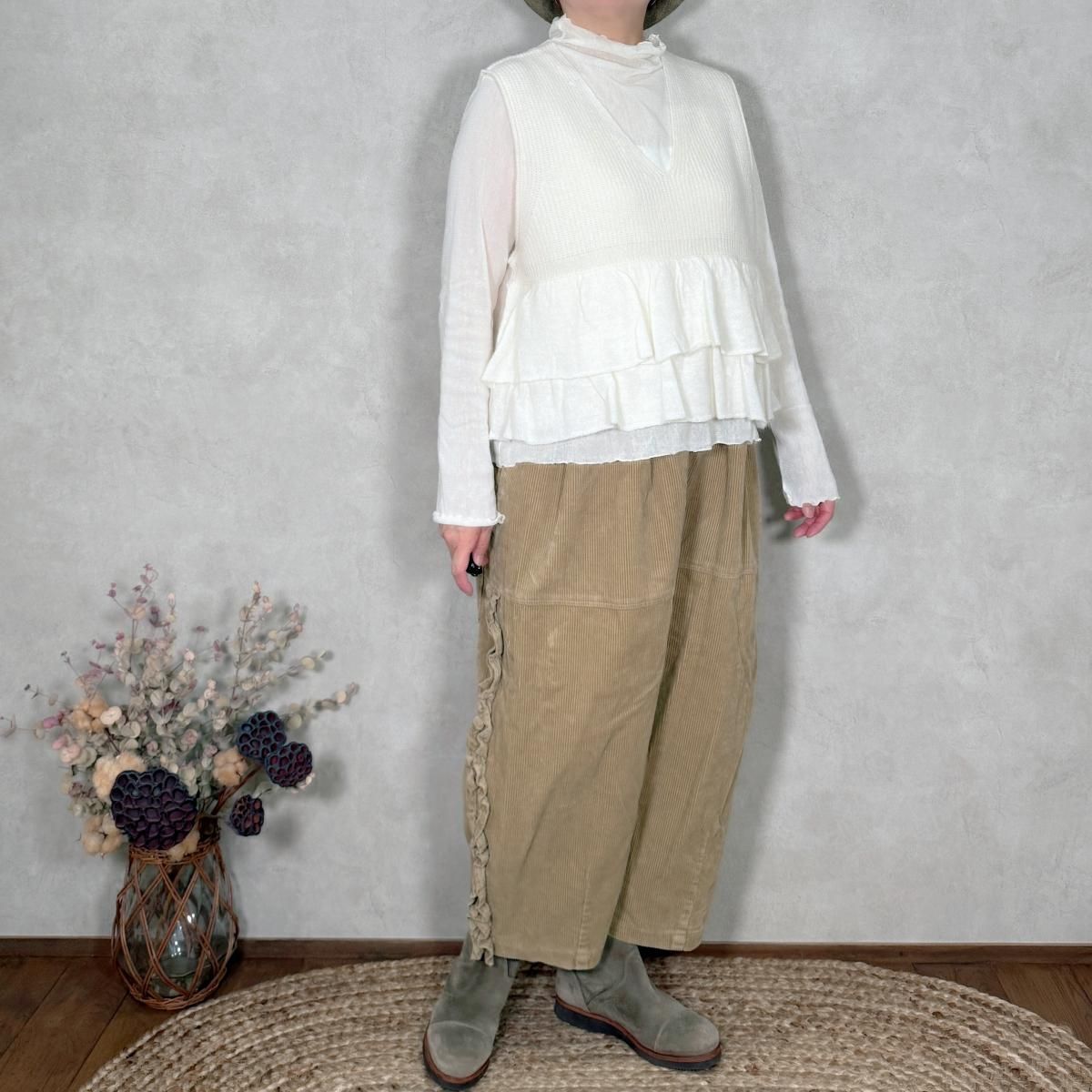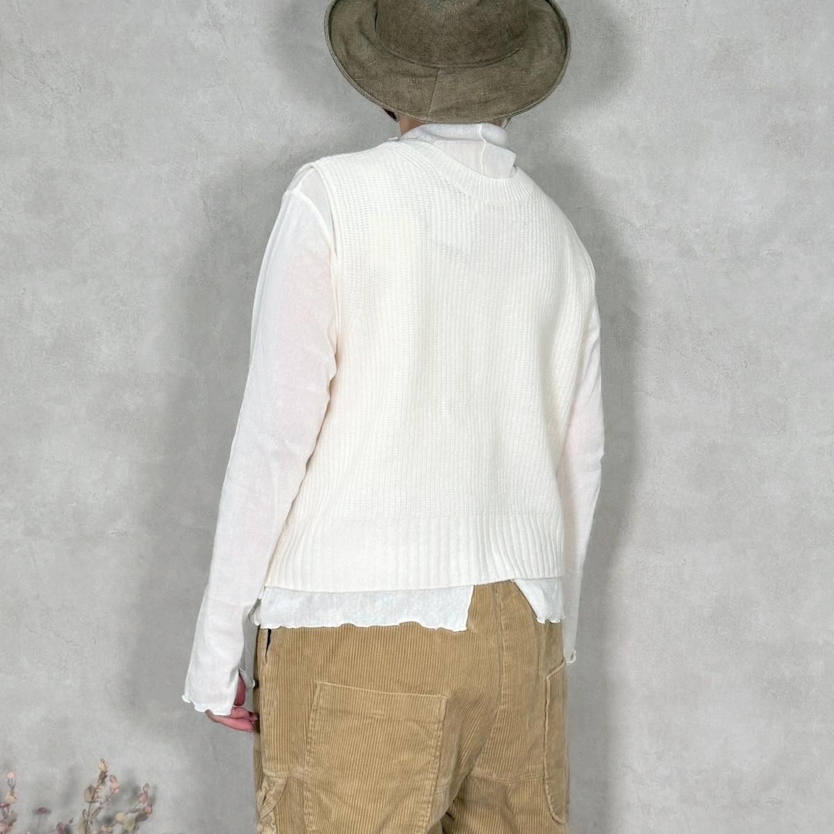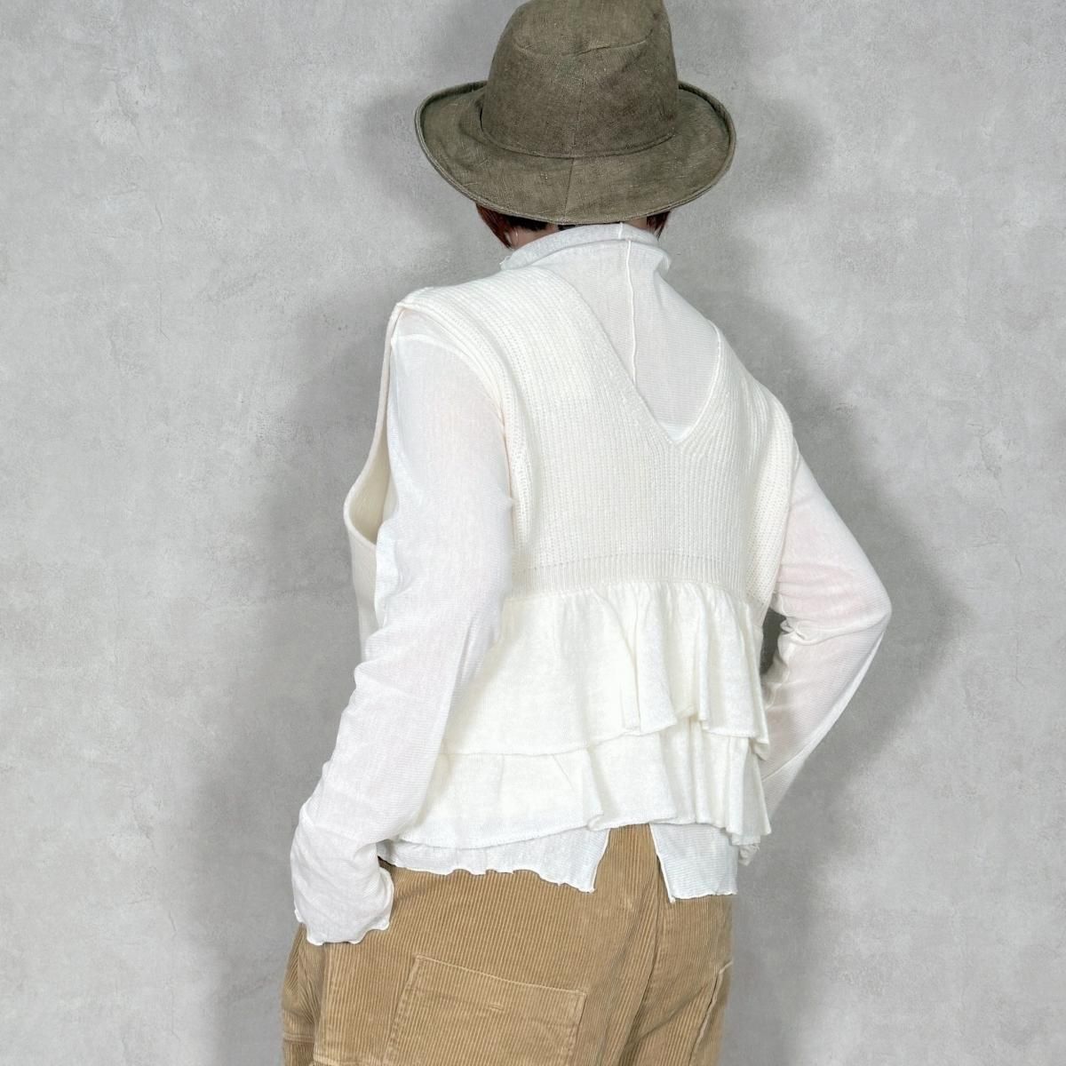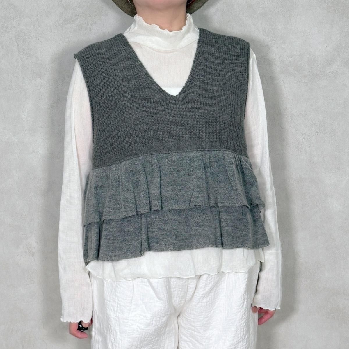 柔らかいメリノウールの糸にふわふわとした細番手のアルパカ混糸が掛け合わされたフリルが可愛いデザインのニットベストです。前後2WAYで着用頂けます。 Material: ウール 100% Size Free(約):身幅 57cm, 着丈 56cm, 肩幅 43cm, アームホール 66cm Made in China