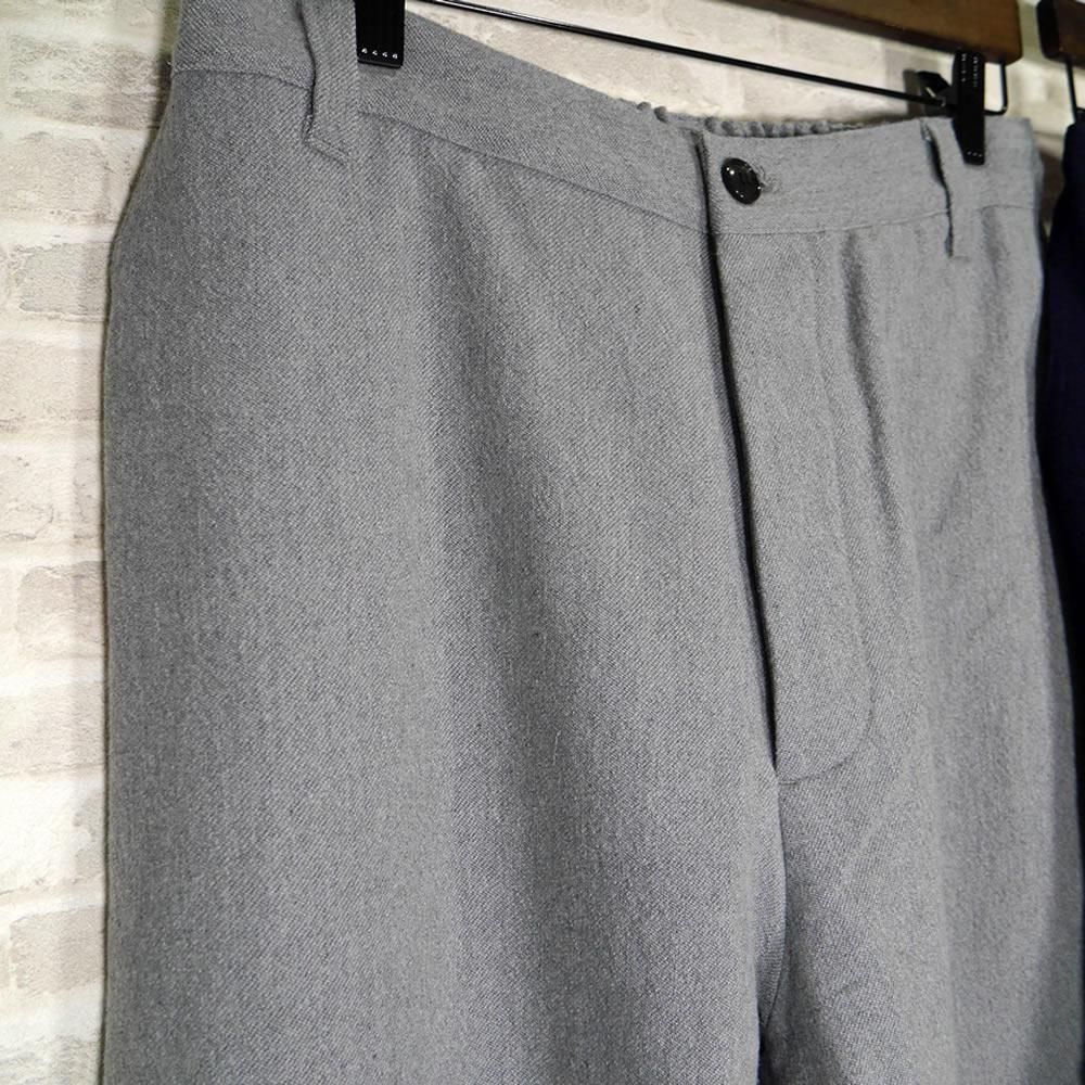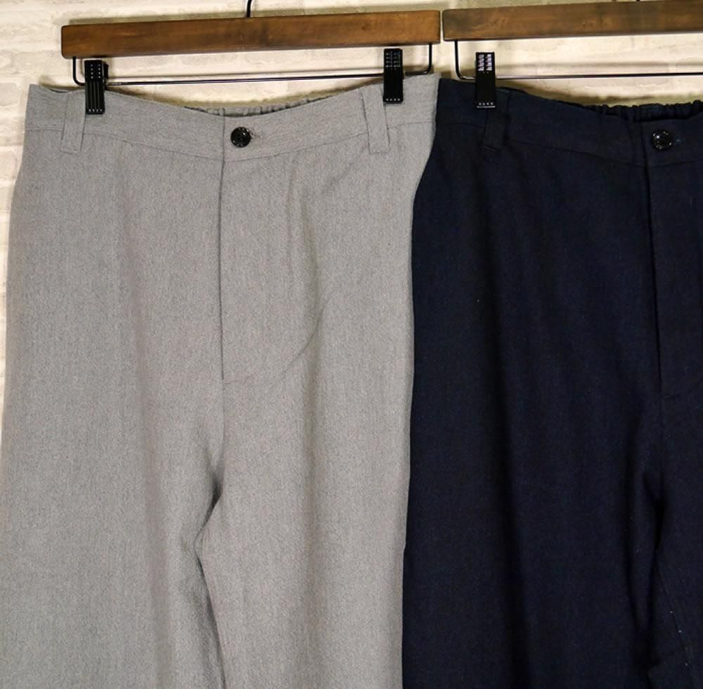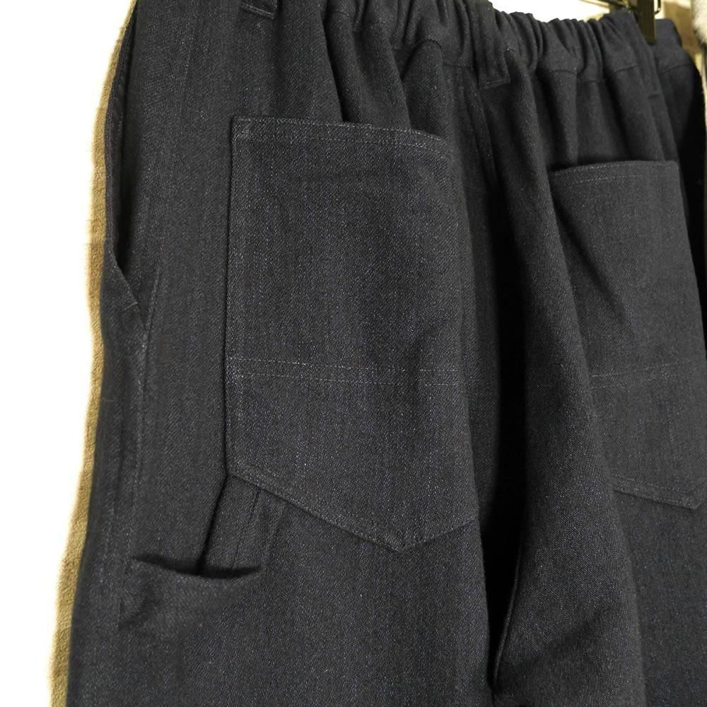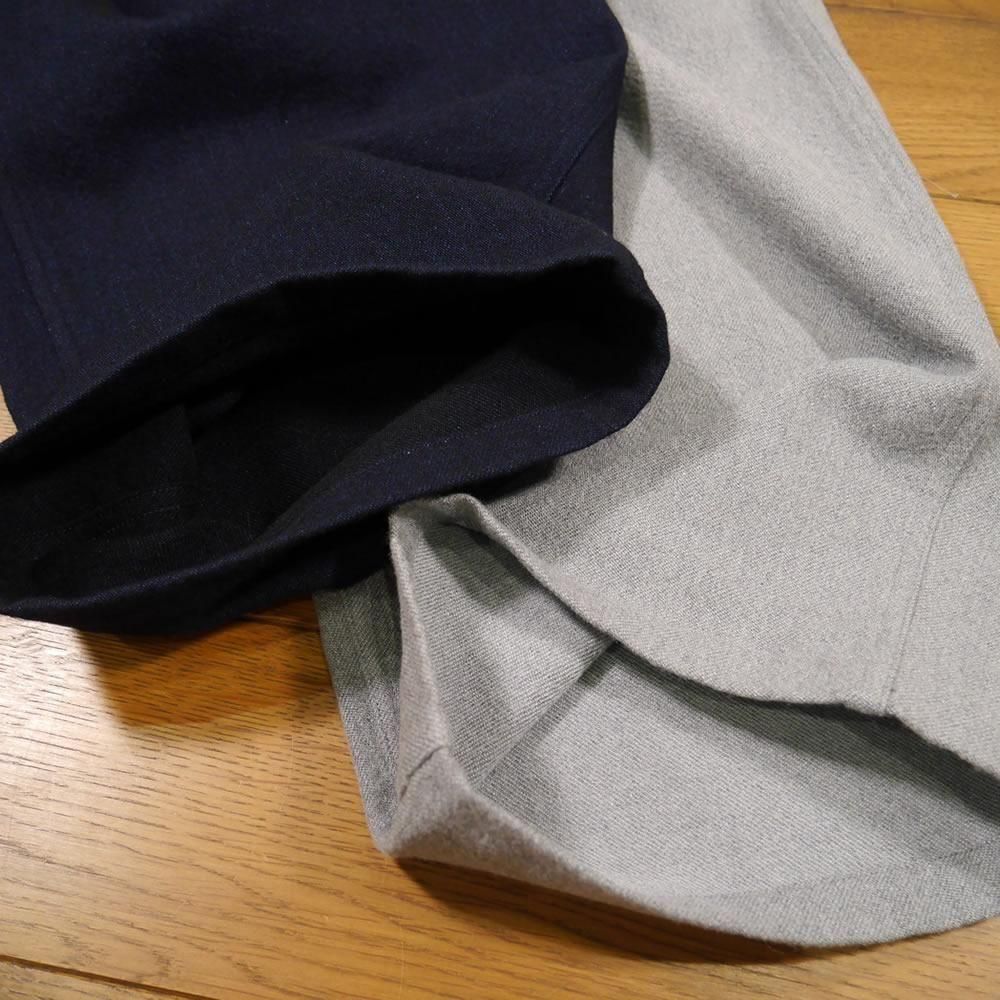 デニムの産地である岡山県にて織られたコットンウールのデニム素材のパンツになります。コットンのたて糸にウールのよこ糸を打ち込んだ生地は表面に凸凹のある立体的な表情が特徴的。見た目の重量感とは異なり、着用時に軽く感じられるのも魅力です。