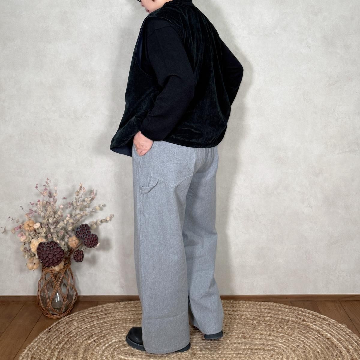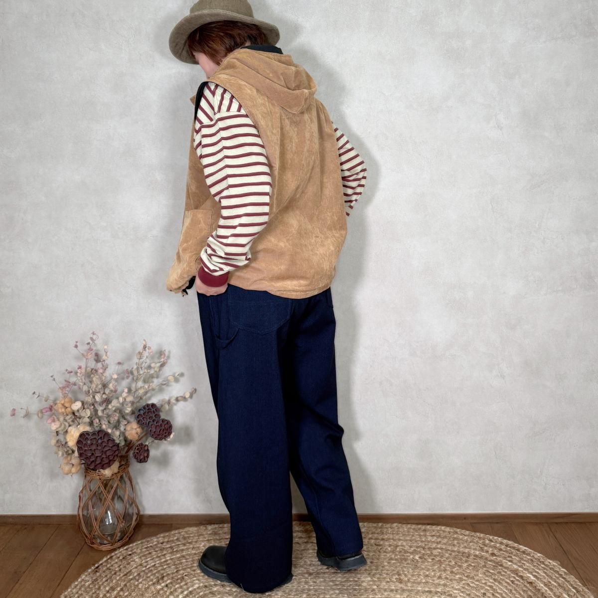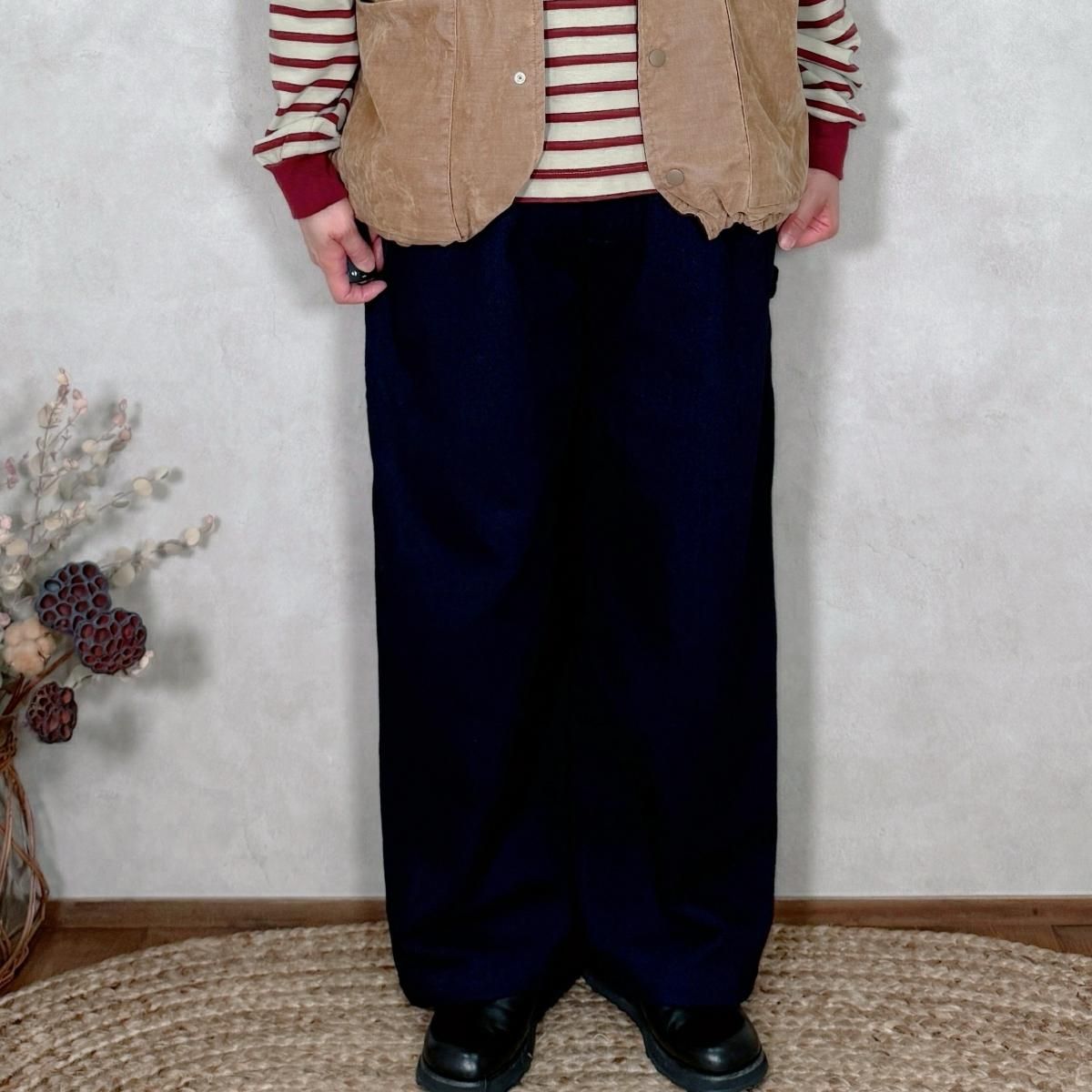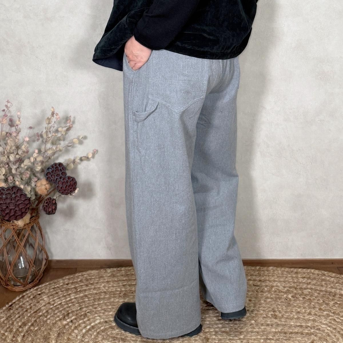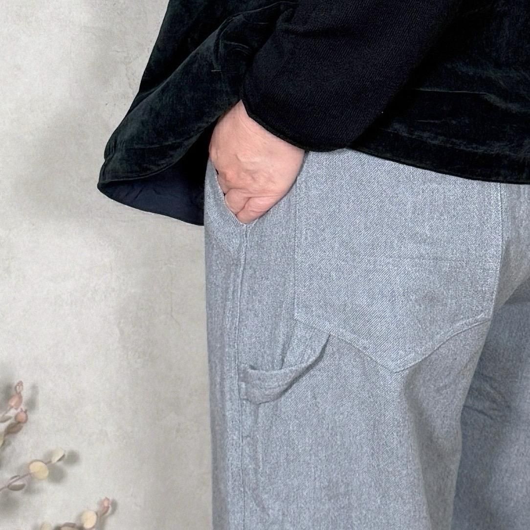 暖かみのあるコットンウールのデニムパンツ。前開きはボタンフライ仕様。ツールポケットやハンマーループなどワークパンツの要素が追加され、カジュアルなデザインになっています。
