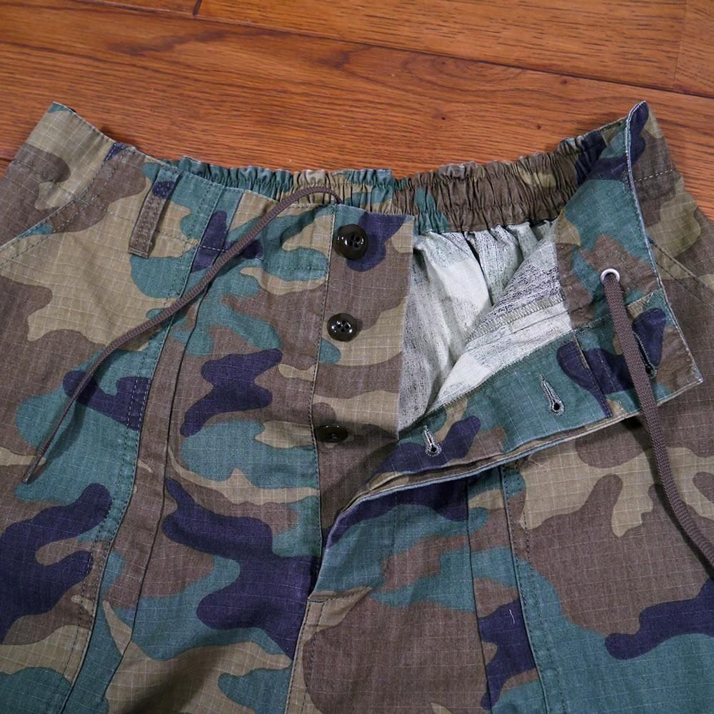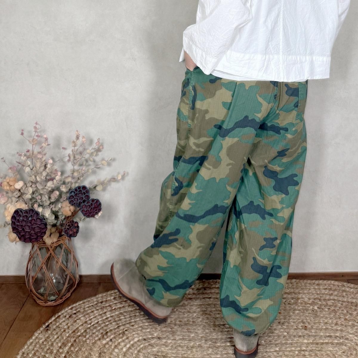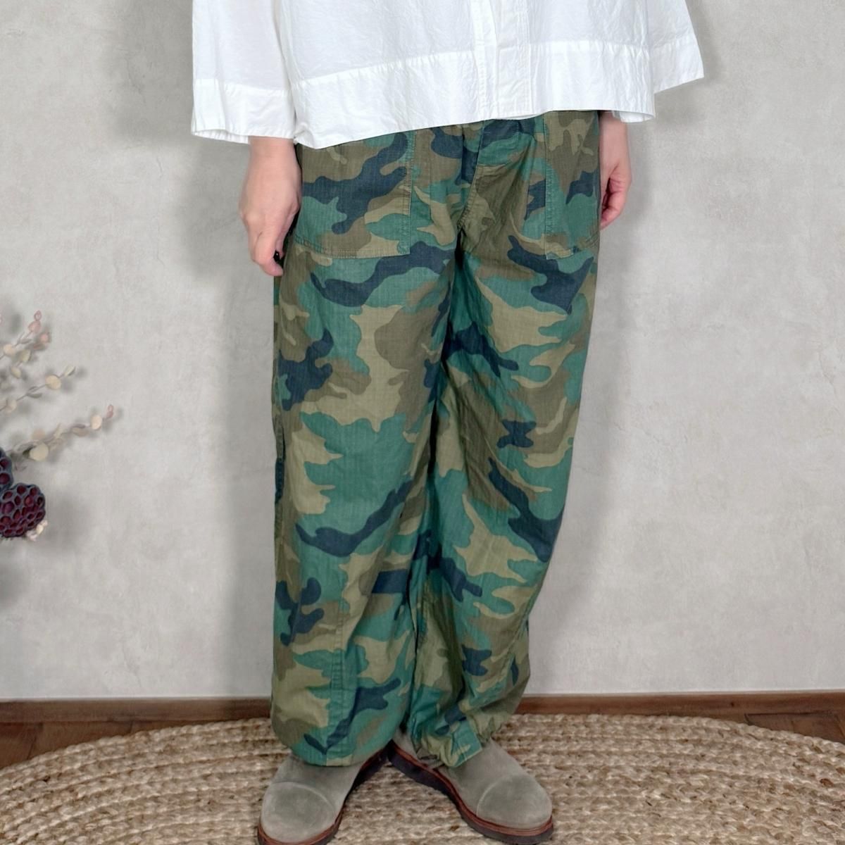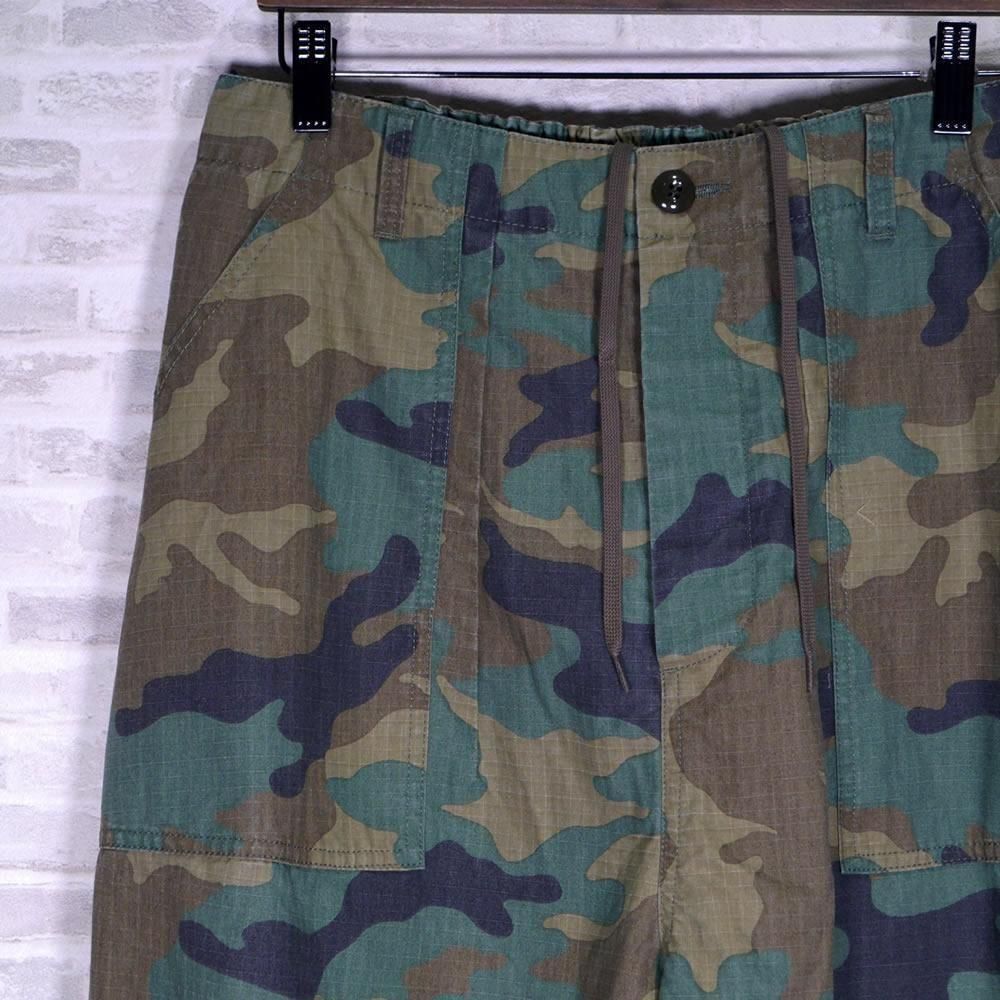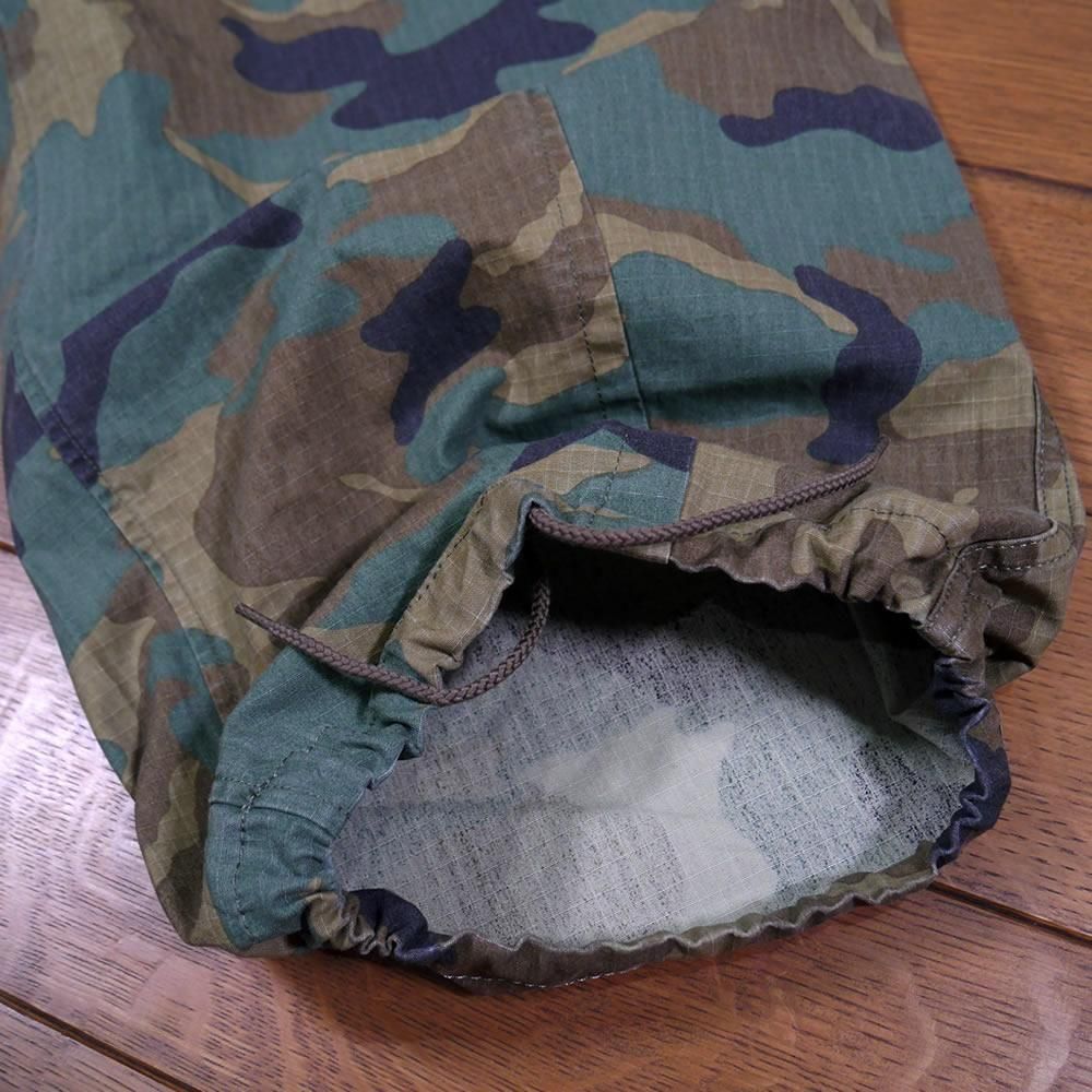 ハリのあるコットンのリップストップ素材が使われたパンツになります。顔料染めの生地に製品でバイオ加工を施し、程良いフェード感を出しています。カモフラージュ柄をご用意しました。