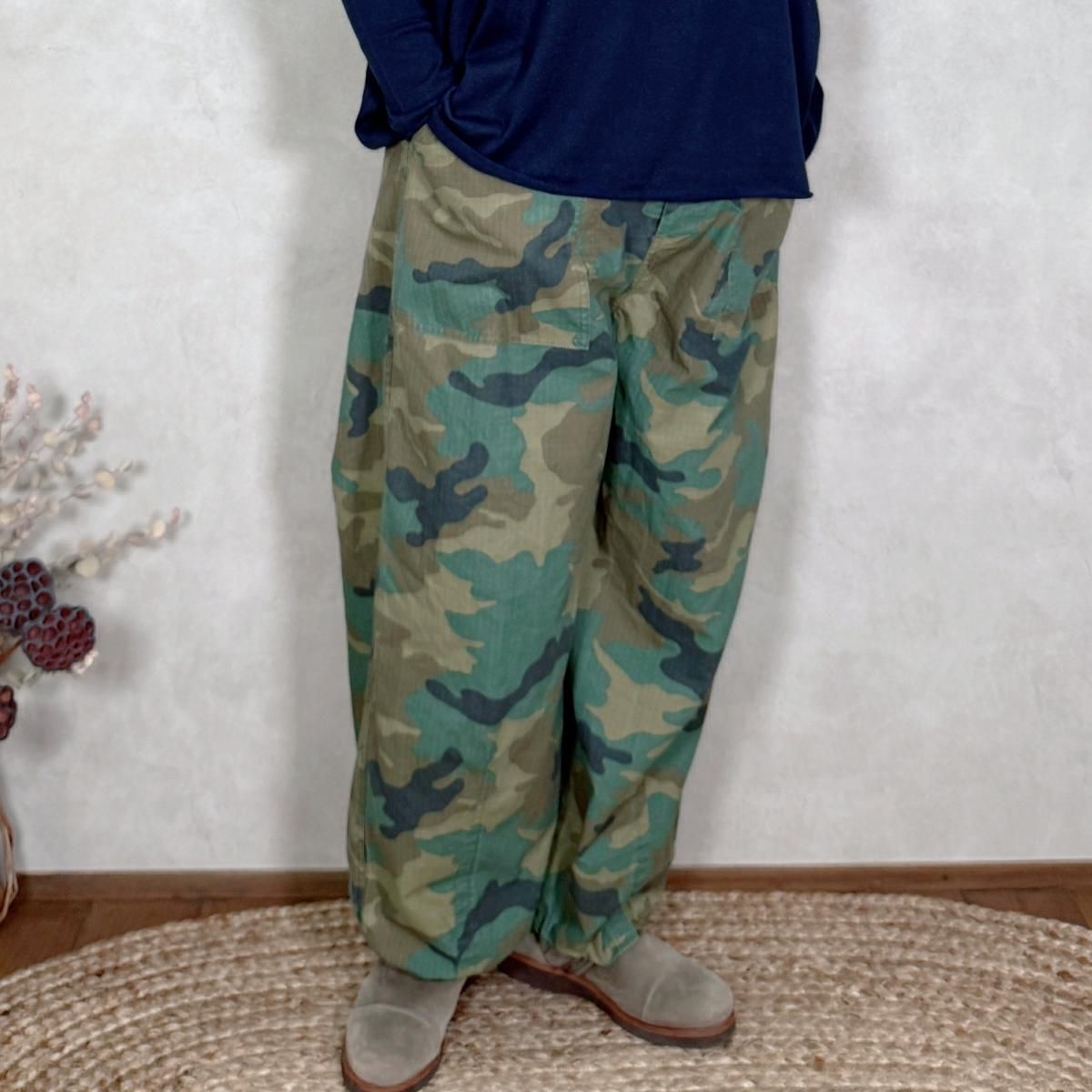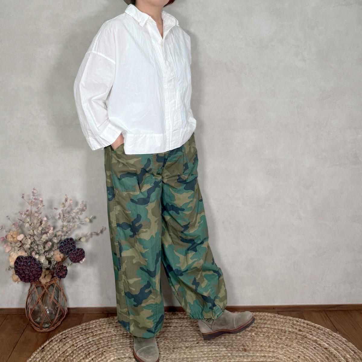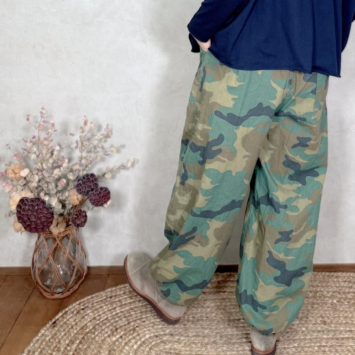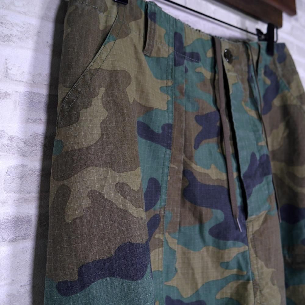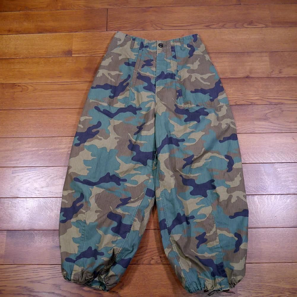 ハリのあるコットンのリップストップ素材が使われたパンツになります。顔料染めの生地に製品でバイオ加工を施し、程良いフェード感を出しています。カモフラージュ柄をご用意しました。