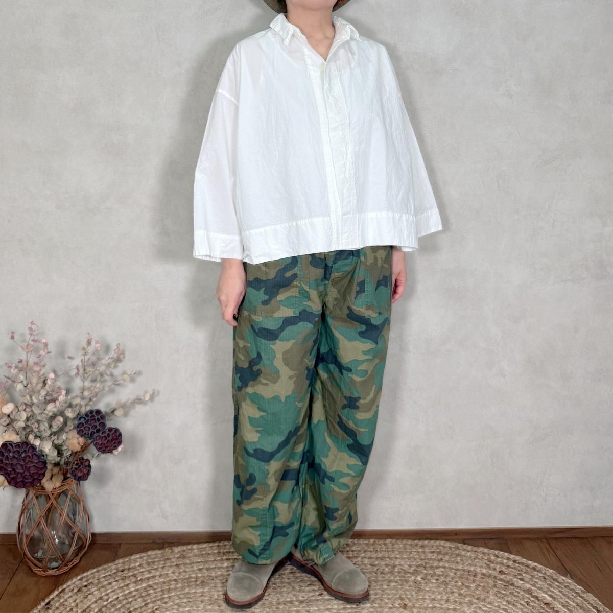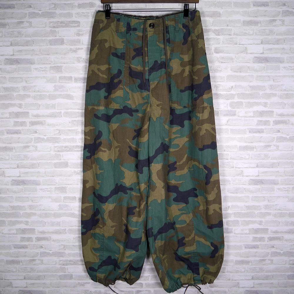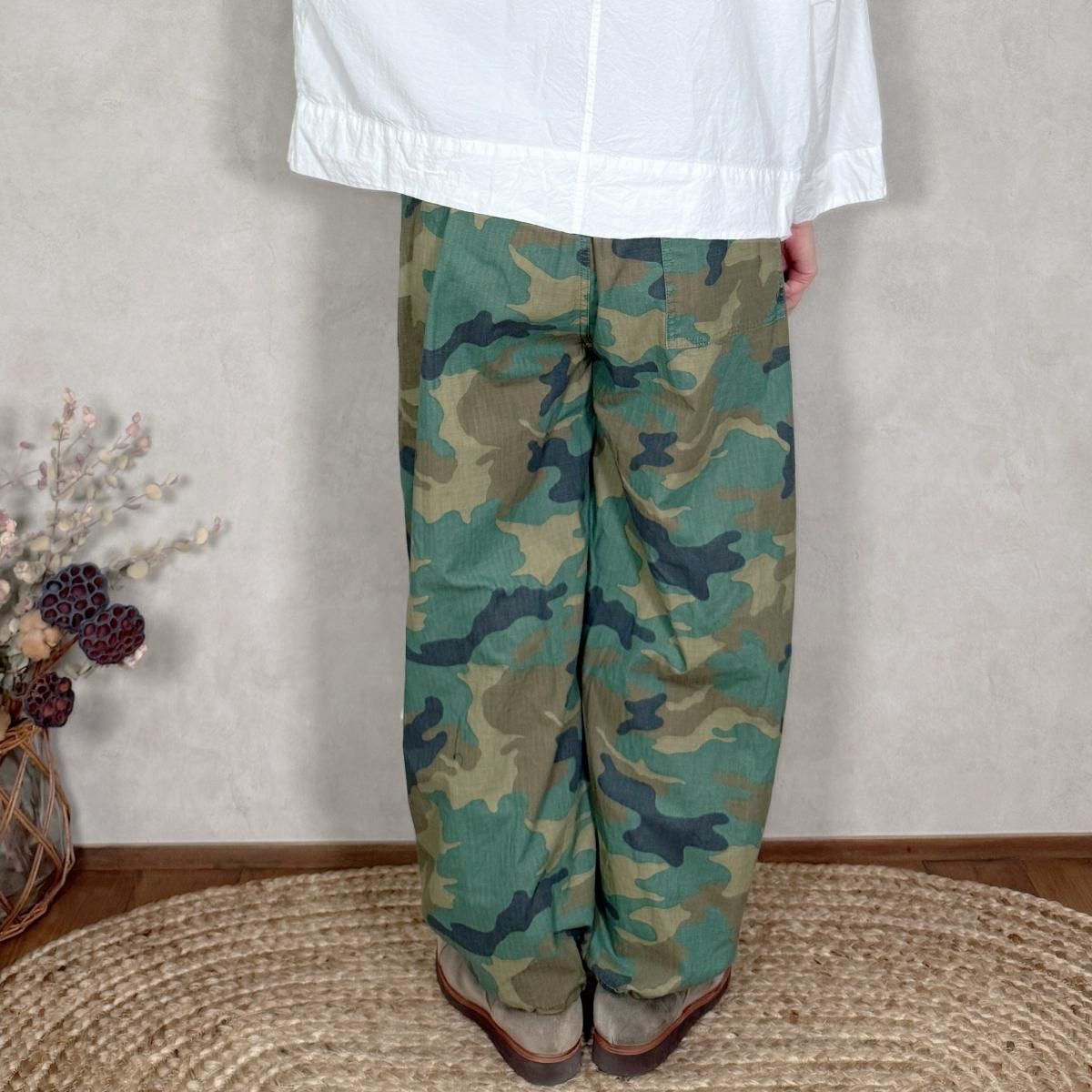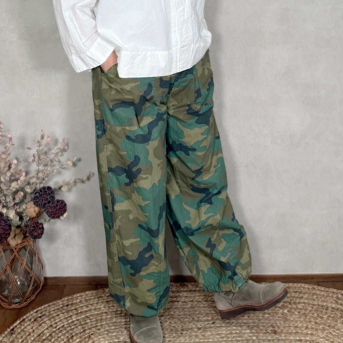 ハリのあるコットンのリップストップ素材が使われたパンツになります。顔料染めの生地に製品でバイオ加工を施し、程良いフェード感を出しています。カモフラージュ柄をご用意しました。