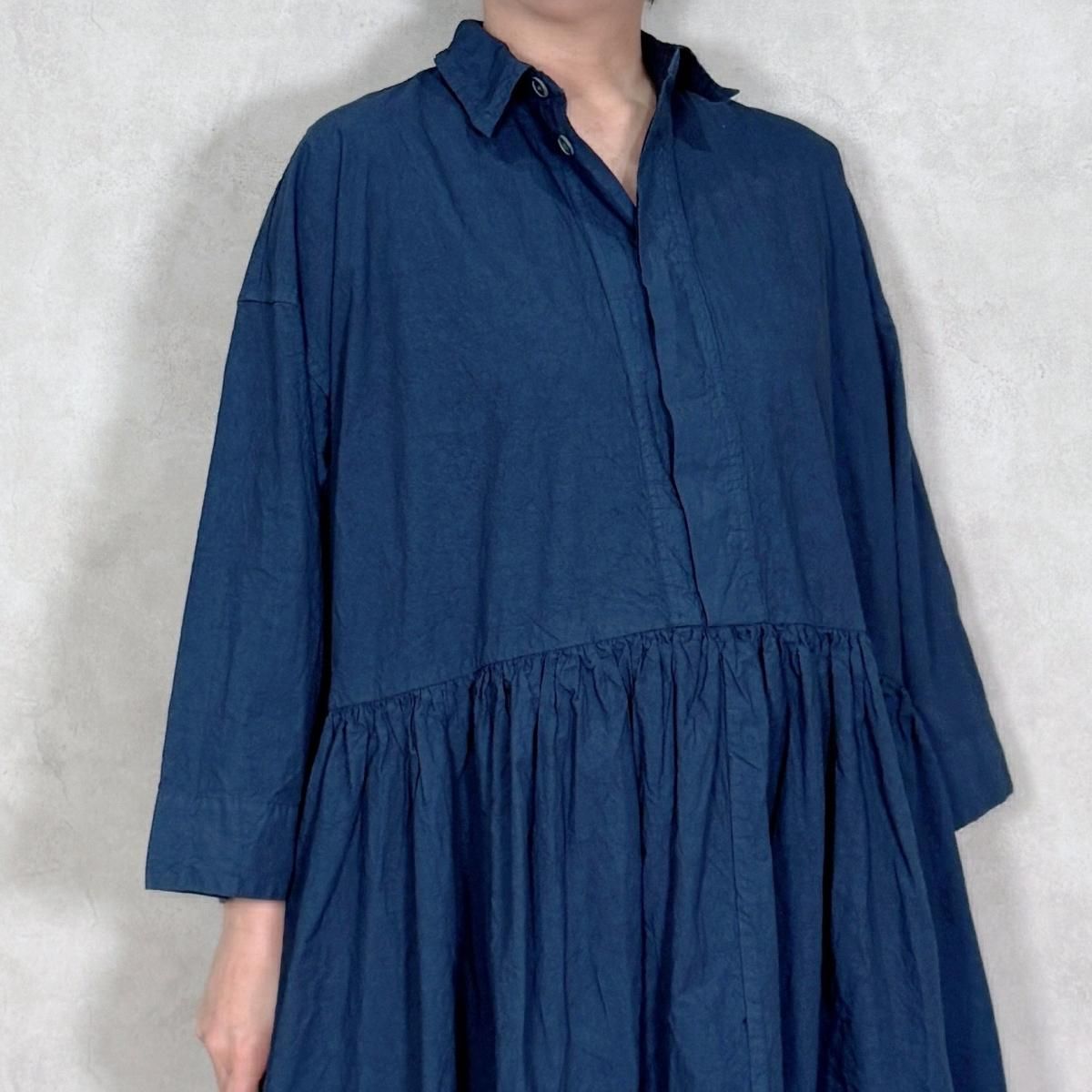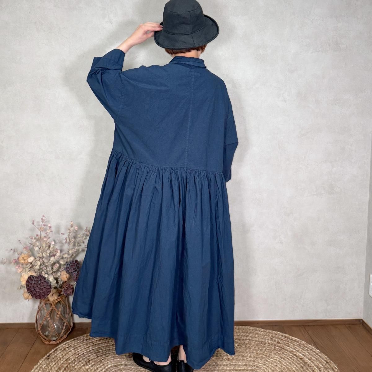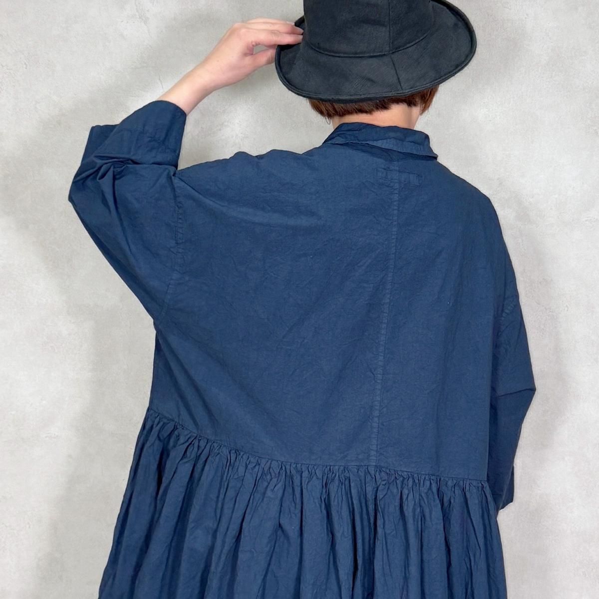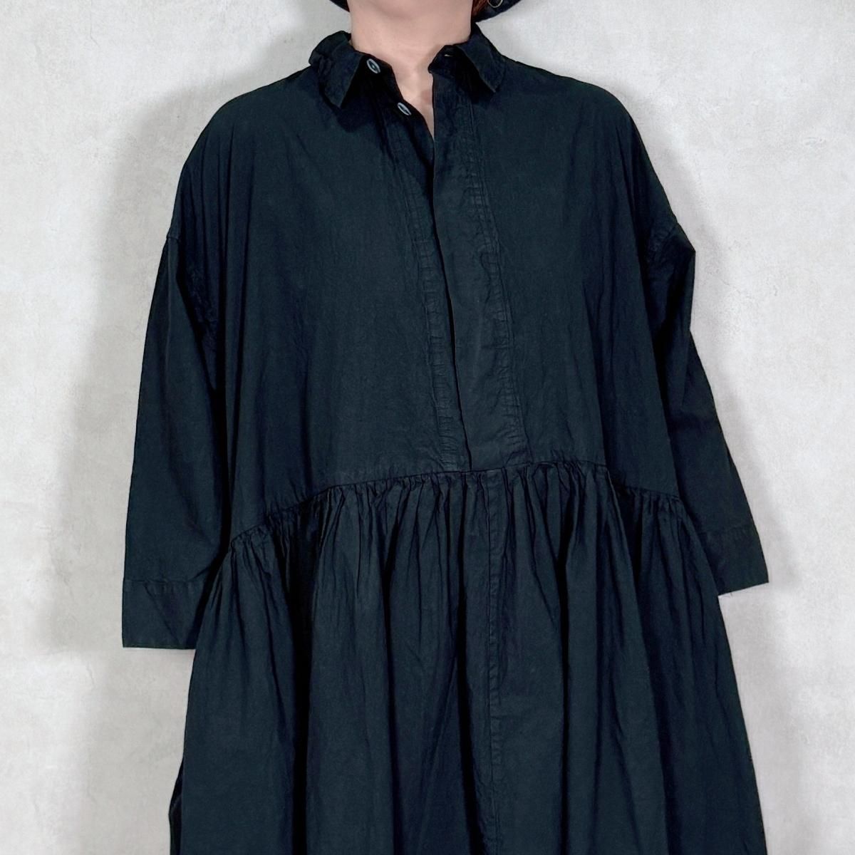 ハリのあるコットン生地が使われたワンピースになります。フロントは比翼仕立てでスッキリしたデザインから、ギャザーが印象的な1着。たっぷりと生地が使われていますが、ゴワ付く事なく、軽い着心地です。通年お使い頂けるギャザーワンピースです。 Material: コットン 100% Size Free(約):身幅 75cm, 着丈 123cm, 肩幅 64cm, アームホール 58cm Made in Japan