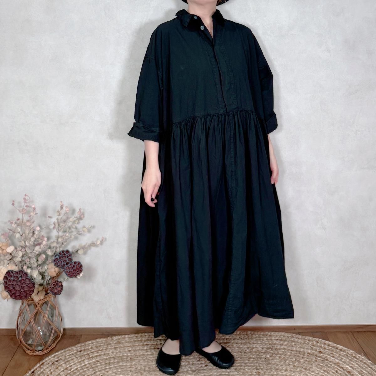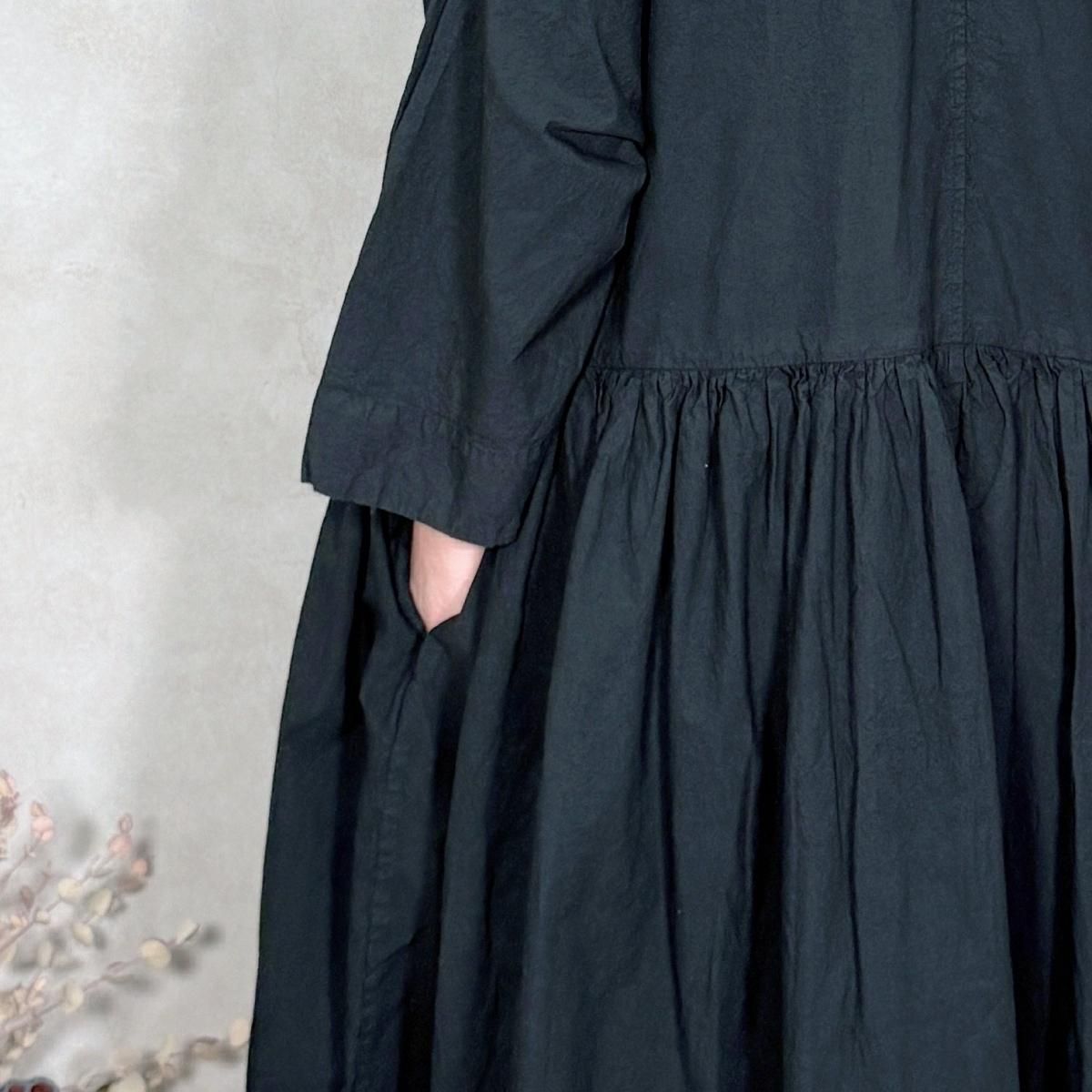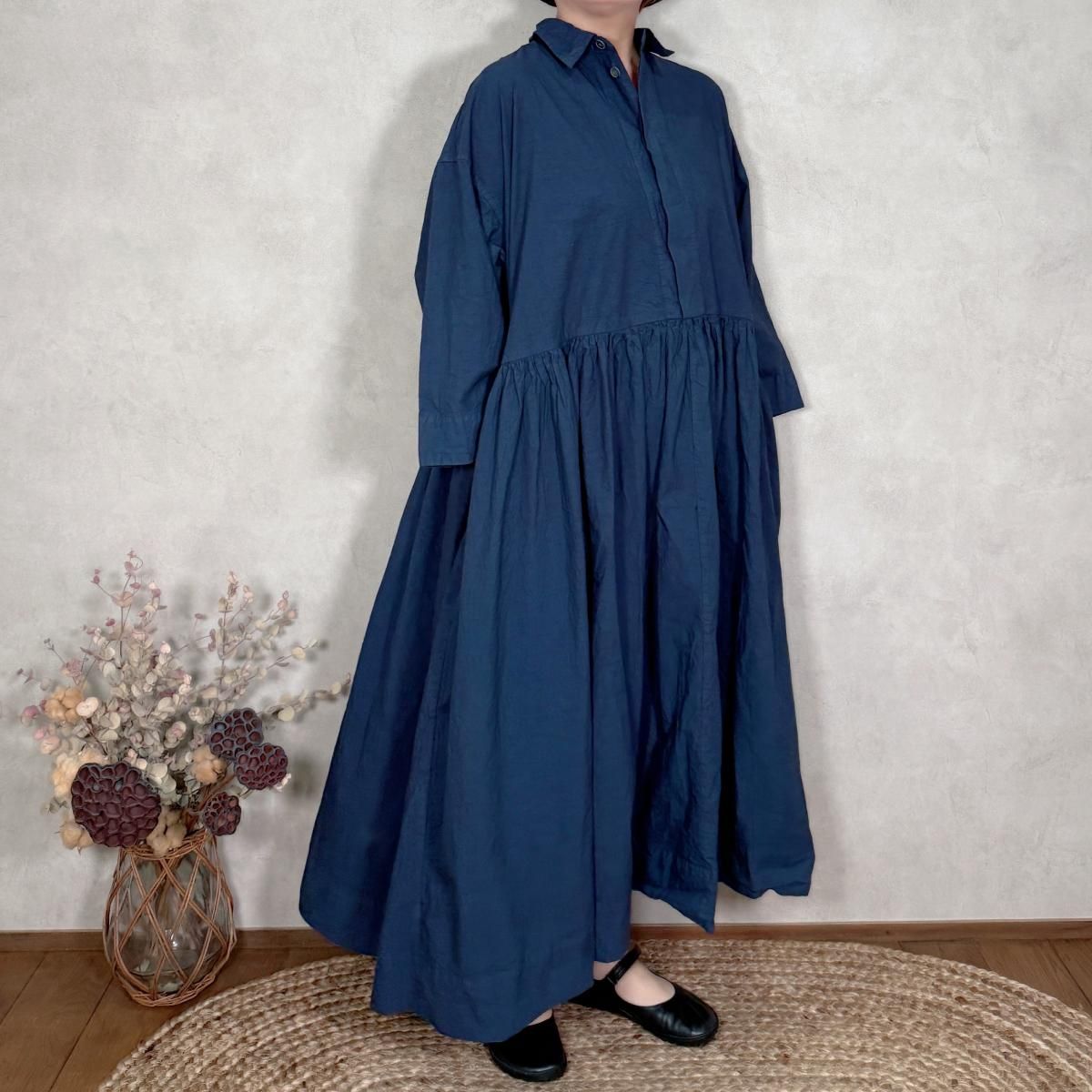 ハリのあるコットン生地が使われたワンピースになります。フロントは比翼仕立てでスッキリしたデザインから、ギャザーが印象的な1着。たっぷりと生地が使われていますが、ゴワ付く事なく、軽い着心地です。通年お使い頂けるギャザーワンピースです。 Material: コットン 100% Size Free(約):身幅 75cm, 着丈 123cm, 肩幅 64cm, アームホール 58cm Made in Japan