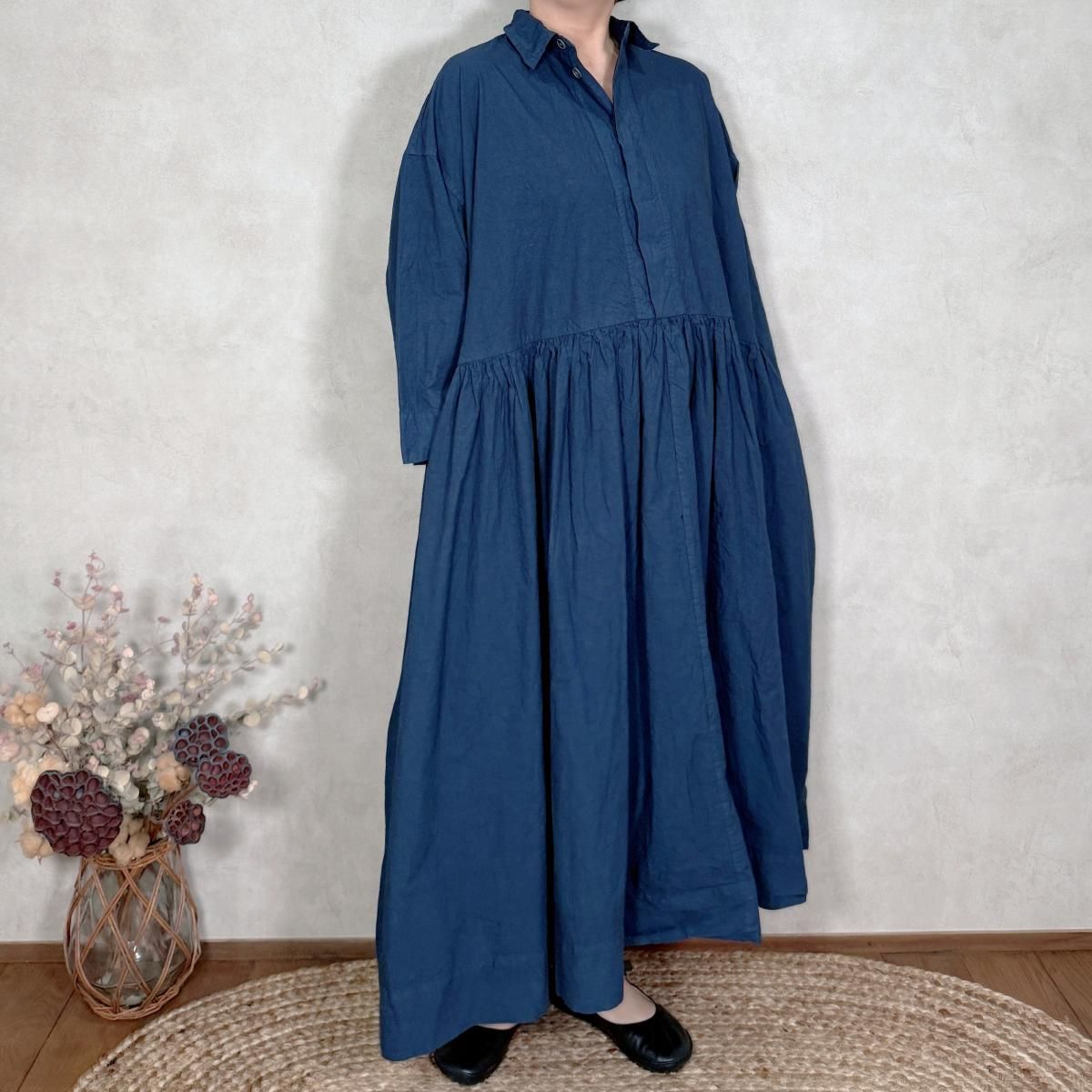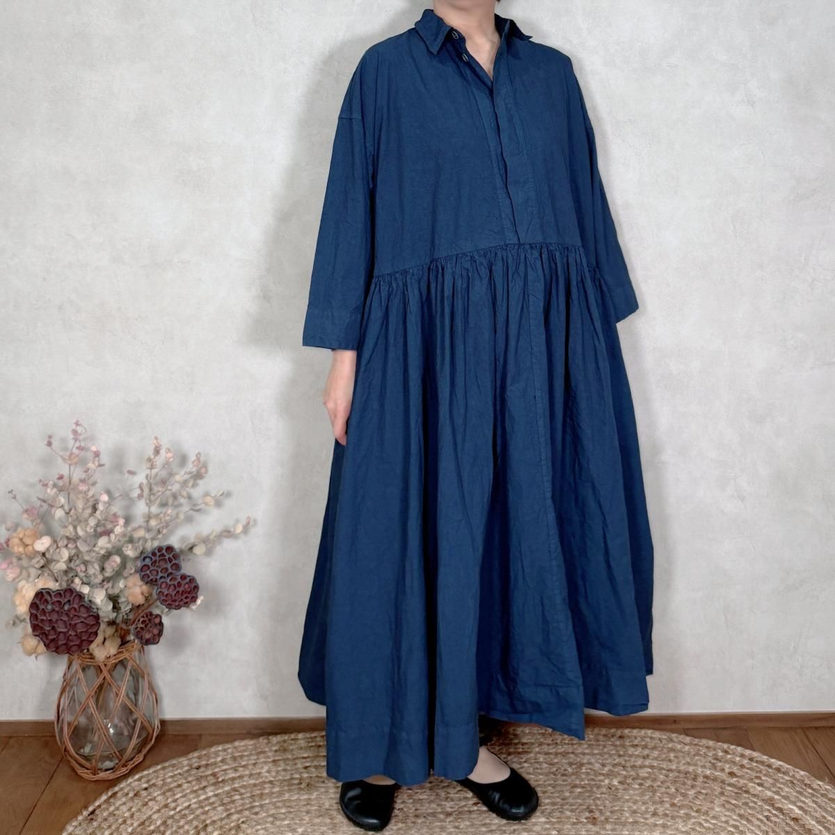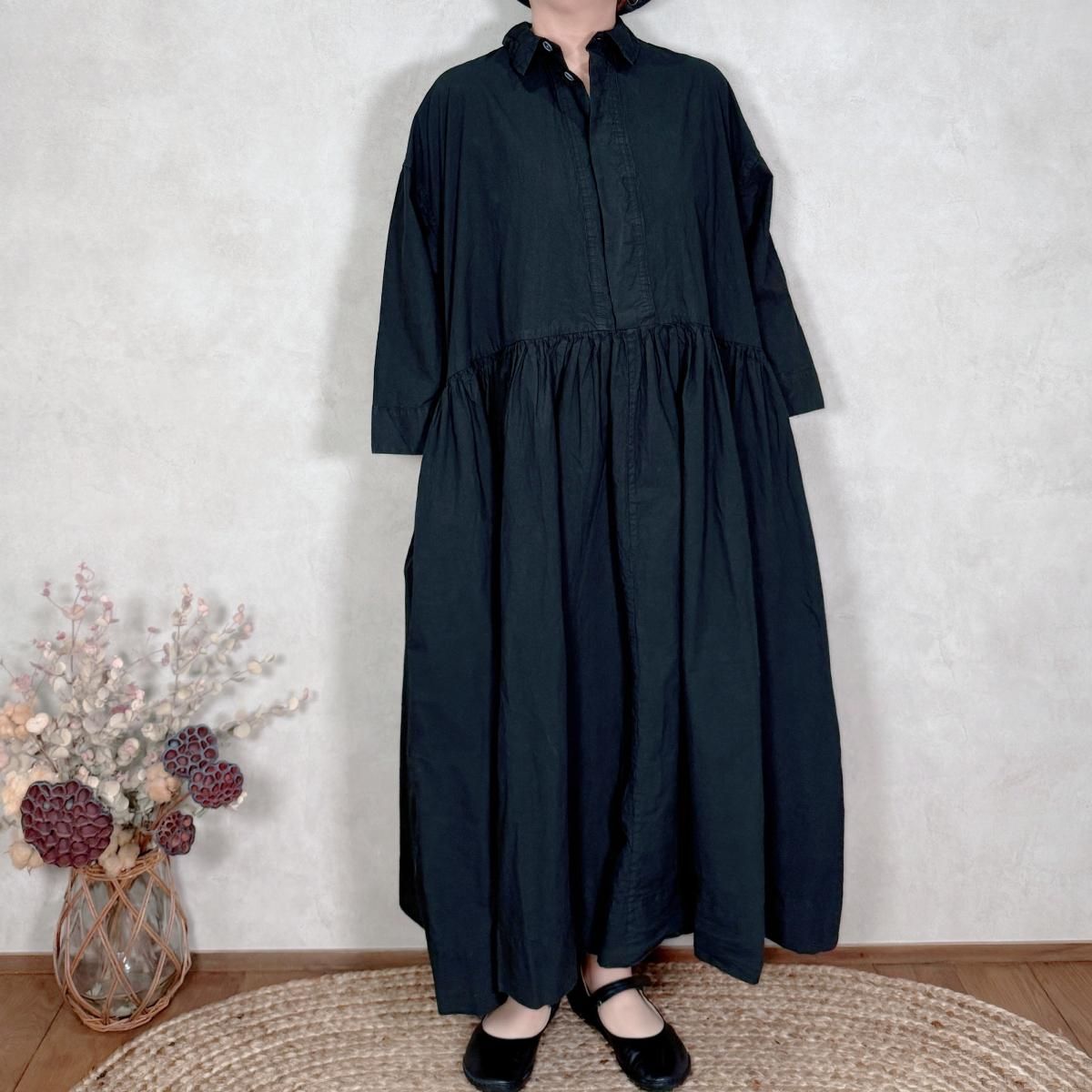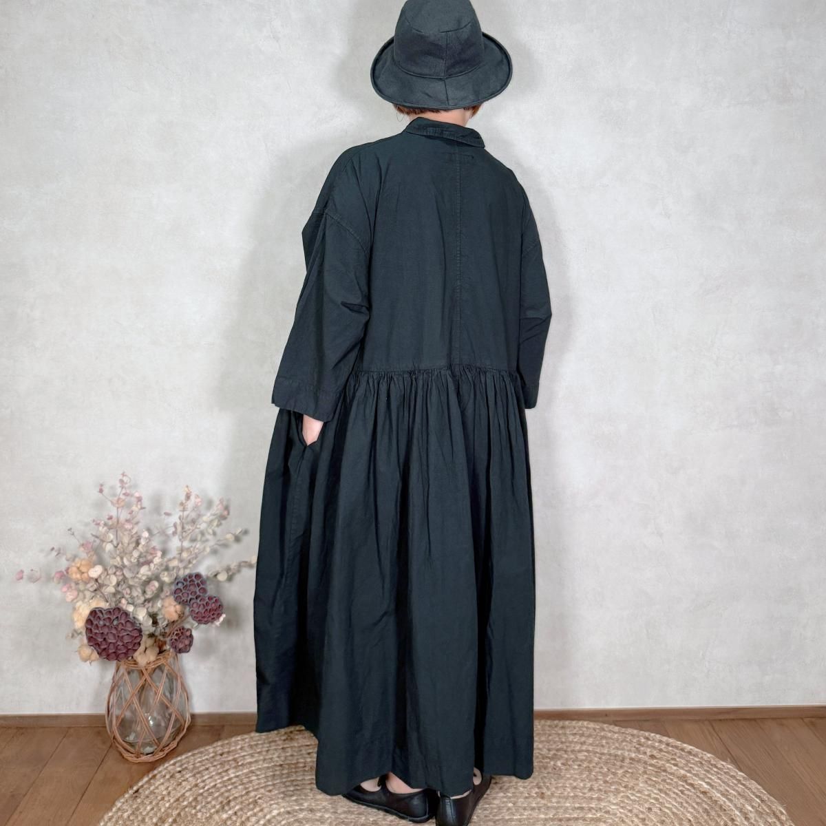 ハリのあるコットン生地が使われたワンピースになります。フロントは比翼仕立てでスッキリしたデザインから、ギャザーが印象的な1着。たっぷりと生地が使われていますが、ゴワ付く事なく、軽い着心地です。通年お使い頂けるギャザーワンピースです。 Material: コットン 100% Size Free(約):身幅 75cm, 着丈 123cm, 肩幅 64cm, アームホール 58cm Made in Japan
