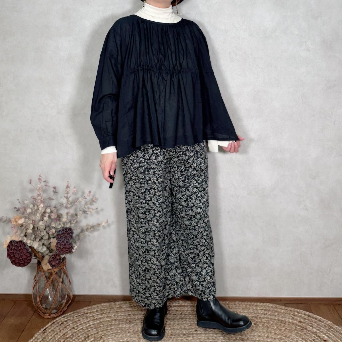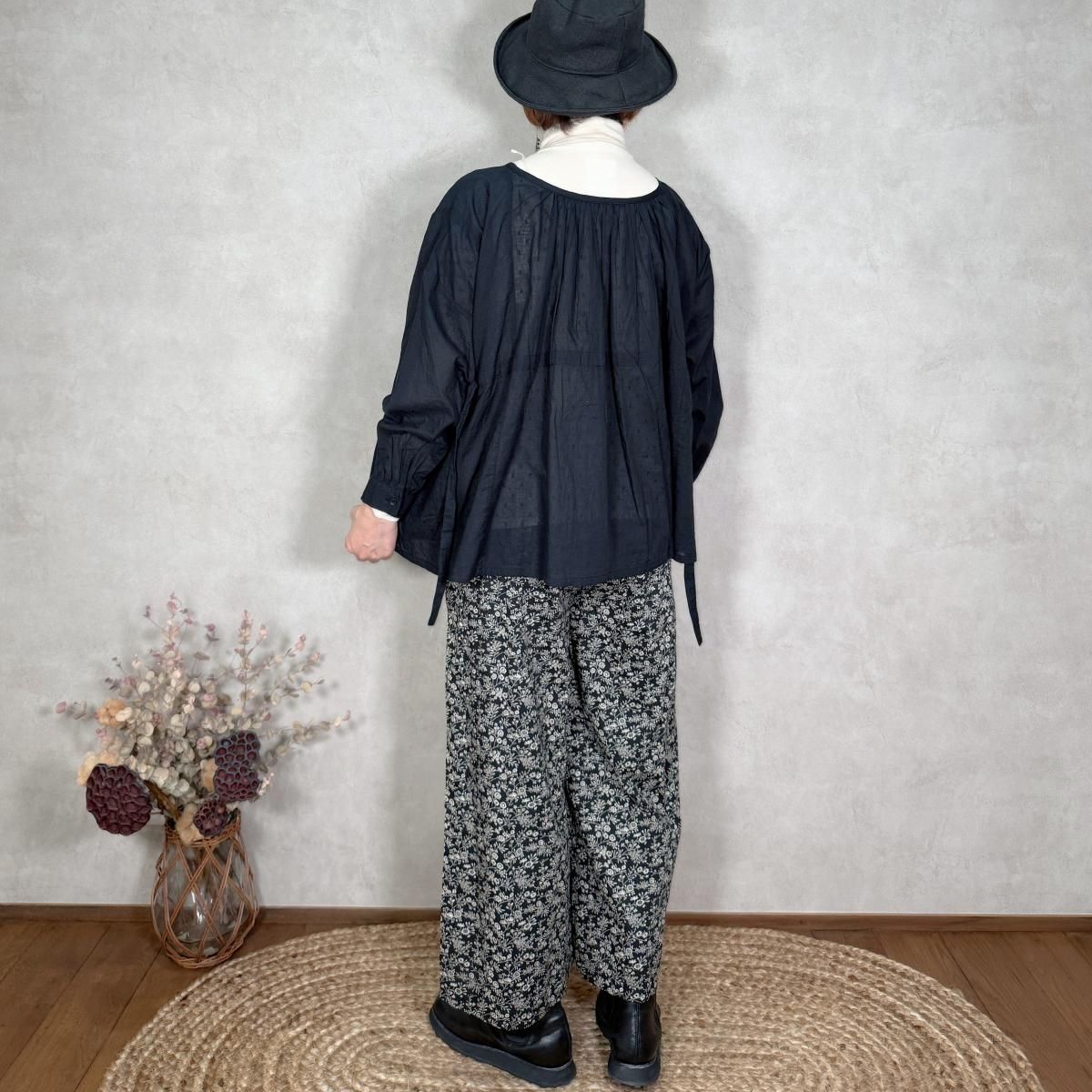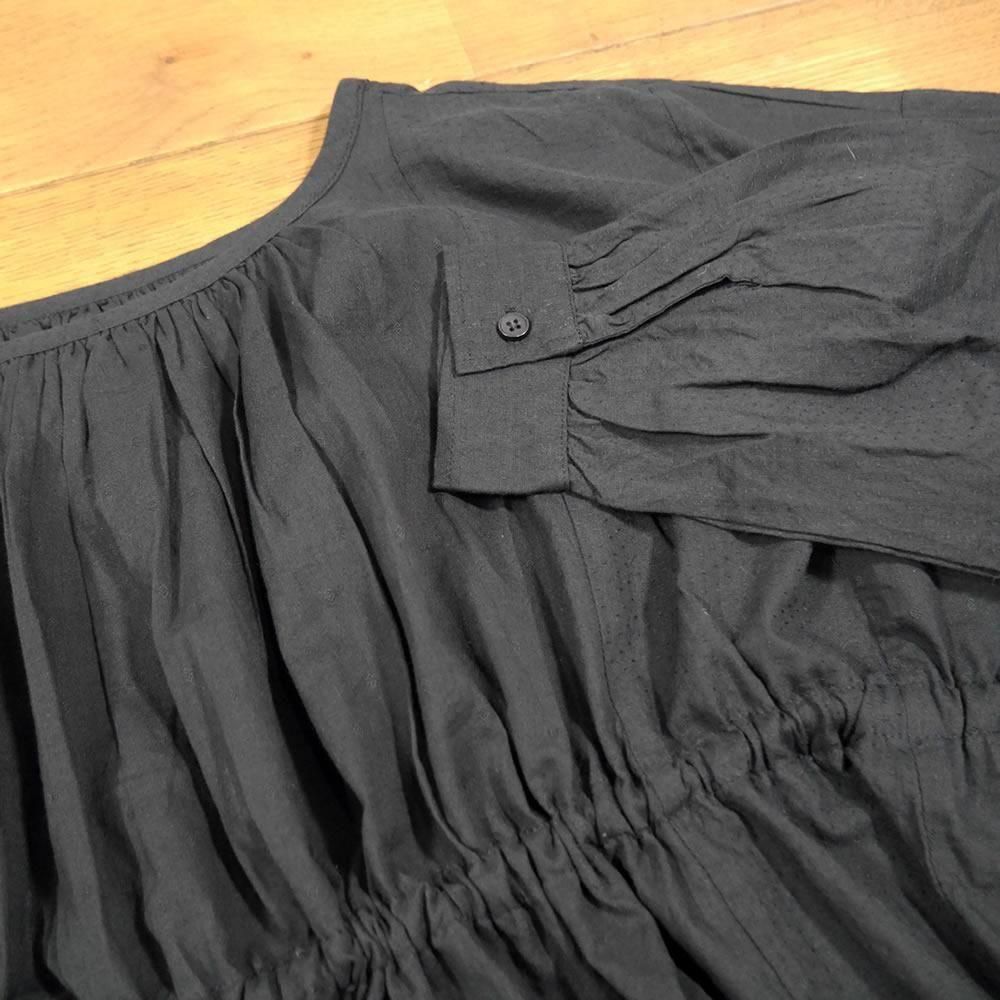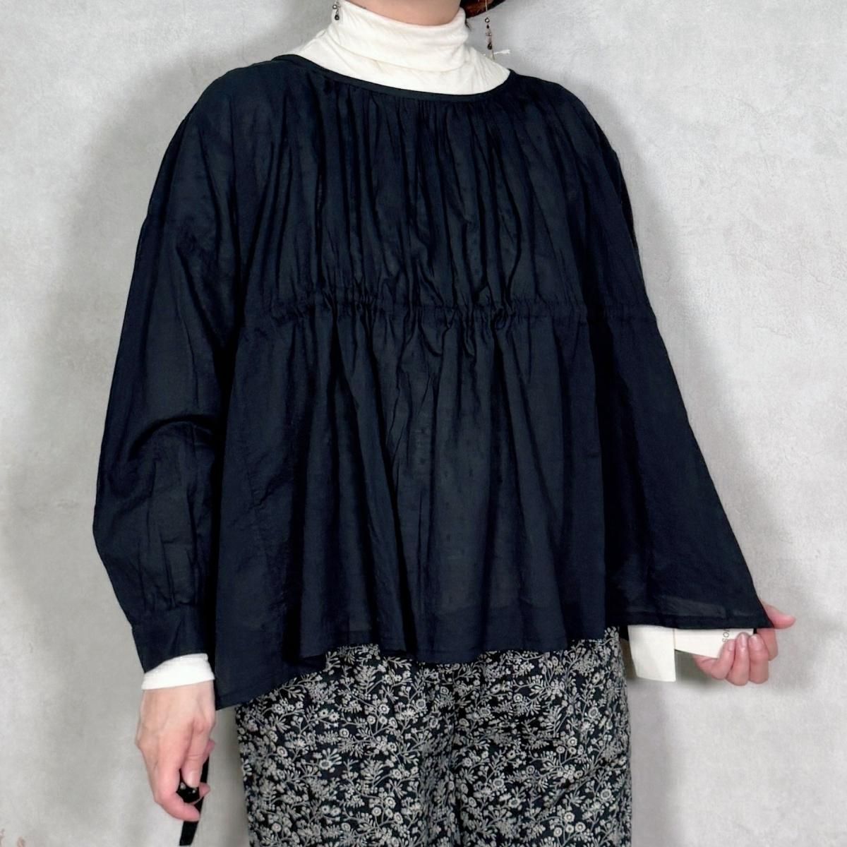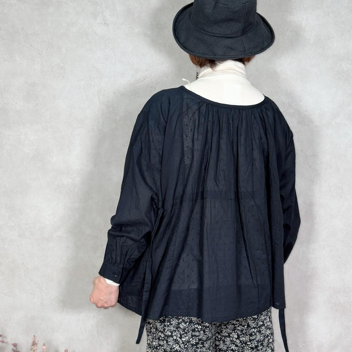 薄手のコットンドビー生地を使ったギャザーが可愛いスモックブラウスです。2種類の生地をパッチワークで繋げた生地使い。日に透けると大小ドット柄が透けて見えます。片側のウエストのギャザーを絞れる使用なので、シルエットの変化をお楽しみ頂けます。前後2WAYで着用可能です。